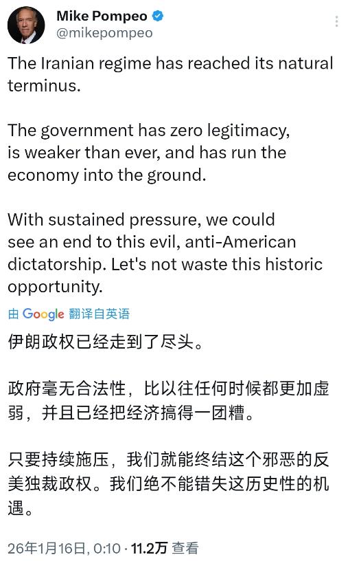 瘦到脱相的美国前国务卿蓬佩奥今天(北京时间1月16日)发文写道:“伊朗政权已经走到了尽头。政府毫无合法性,比以往任何时候都更加虚弱,并且已经把经济搞得一团糟。只要持续施压,我们就能终结这个邪恶的反美独裁政权。我们绝不能错失这历史性的机遇。” 瘦到脱相的美国前国务卿蓬佩奥在北京时间1月16日发文宣称伊朗政权走到尽头,这种说法压根没贴合伊朗的真实局势。他口中“毫无合法性”的指控,完全无视了伊朗国内的实际动态。 1月12日,德黑兰的恩格拉布广场上就有上万民众聚集参加支持政府的集会,这股明确的支持力量直接戳破了所谓“政权失能”的谎言。 更关键的是,伊朗官方在1月14日已经宣布控制住国内局势,身居当地的消息源也证实,首都德黑兰连续两天没有出现抗议活动,政权对国家的掌控力并没有蓬佩奥渲染的那么脆弱。 蓬佩奥吐槽伊朗经济“一团糟”,却刻意回避了最核心的原因。就在他发文前一天,也就是当地时间1月15日,美国财政部刚宣布对伊朗实施新制裁,不仅把最高国家安全委员会秘书拉里贾尼列入名单,还针对18名涉及石油和石化出口的个人及实体下手。 美国国务院当天也发布声明,明确要通过制裁切断伊朗的金融网络和全球银行系统接入渠道。 这些持续加码的制裁措施正直接冲击伊朗的经济命脉,而蓬佩奥早有过类似表态,他此前接受采访时甚至承认制裁会伤害伊朗民众,却宣称这种伤害为了达到美国目标“没关系”。 把自己一手造成的后果甩锅给伊朗政府,这种逻辑实在站不住脚。 所谓“持续施压就能终结政权”的论调,更暴露了美国一贯的干涉野心。这轮伊朗内部动荡中,美国和以色列的联动痕迹其实非常明显。 以色列安全组织摩萨德宣称与抗议者站在一起,内塔尼亚胡不断鼓动推翻政权,特朗普也曾放出“武力干涉”的狠话。 美国著名经济学家杰弗里·萨克斯直接点破,这就是“中央情报局/摩萨德政权更迭的剧本”,先制造混乱引发流血冲突,再借机插手干涉。 但即便如此,他们的判断也多次出现偏差,以色列方面一开始认为抗议者无法撼动政权,中途改口后又回归最初的判断,承认伊朗现政权仍牢固控制国家。 蓬佩奥口中的“历史性机遇”,本质上是想延续美国的霸权逻辑。美军虽然已将“亚伯拉罕·林肯”号航母打击群调往中东,还建议非必要人员撤离基地,但特朗普的态度已经出现松动。 他14日公开表示伊朗已停止杀害抗议者,宣称要“拭目以待”,这种言论被广泛解读为军事打击可能性大幅降低。 这说明美国自身也清楚,靠施压和煽动无法真正改变伊朗的局势,所谓“终结政权”更像是自欺欺人的口号。 伊朗政府当下确实面临内外挑战,既要应对外部军事威胁,也要回应国内的改革诉求,但这终究是伊朗的内部事务。 蓬佩奥这番言论,不过是换了种说法的干涉宣言,既无视美国制裁造成的实际伤害,也忽略了伊朗政权的掌控力和民众的真实态度。 国际社会早已看清这种套路,靠施压和煽动制造的所谓“机遇”,终究只会沦为霸权主义的又一注脚。