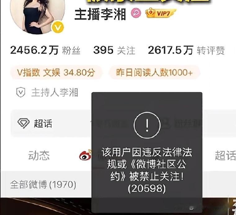 李湘多平台账号被禁止关注!李湘干了什么违法乱纪的事儿? 1月16日,李湘微博,抖音,小红书等多平台账号被禁止关注。 微博提示:“违反法律法规或微博社区公约”。 抖音提示:“账号异常/禁止关注”。 小红书提示:“暂不开放关注功能”。 李湘微博的粉丝有2400多万。 李湘抖音的粉丝有420多万。 李湘小红书的粉丝数有48多万。 李湘的最新动态停留在2025年12月31日,和女儿王诗龄跨年合照。 目前李湘的关联账号,一切正常。王诗龄账号功能正常,可以正常关注和浏览。 截止至16号中午,李湘和工作室对此事件没有做出回应。各平台也没有披露李湘的违规细节。 网友们有知道李湘违反了什么规定吗?是违法了还是违背了?还是违背了社会良俗?