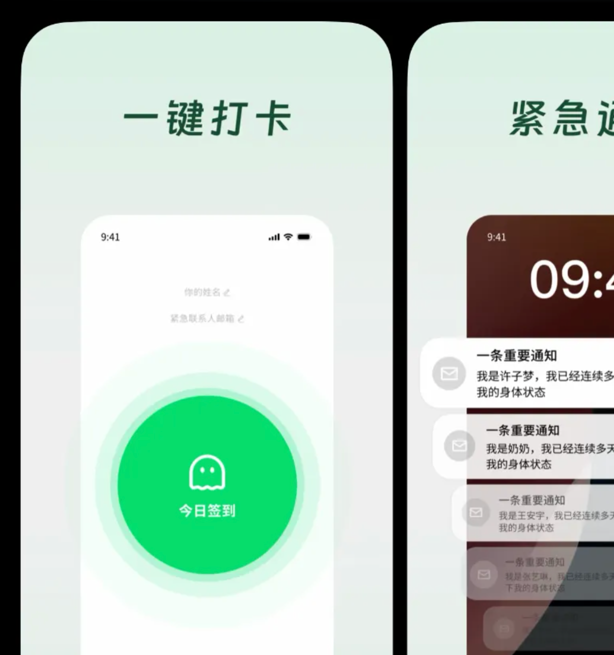 每天按一下“今日签到”,如果忘了,系统会提醒你的紧急联系人。