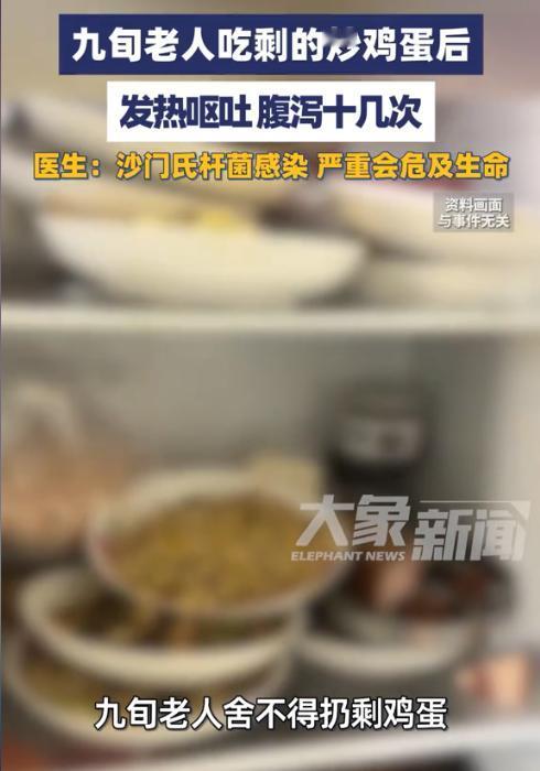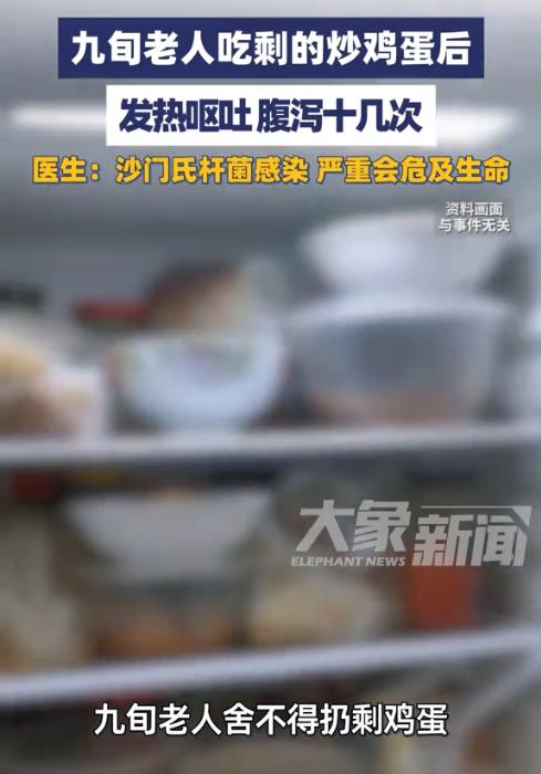 “悲剧还是发生了!”1月14日,河南郑州,一老人由于鸡蛋炒多了便将剩下的放进冰箱里,第二天又拿出来热了一下,没想到吃完后出现发热呕吐症状,甚至腹泻十余次,紧急送医后,医生诊断为沙门氏杆菌感染,警告:严重时会危及生命! 勤俭节约是传统美德,可对于存放过久的剩菜,尤其是老人、小孩等肠胃功能较弱的人群,盲目食用很可能引发健康风险。这位九旬老人就因舍不得扔掉剩炒鸡蛋,食用后险些酿成大祸。 据媒体报道,事发前一天,老人家中做了一份炒鸡蛋,但当时没吃了,老人觉得扔了实在浪费,就放到冰箱里,想着第二天吃了。第二天早上时,老人将鸡蛋拿出来进行了简单的加热,由于时间太短,鸡蛋并没有热透,但是老人也没太在意,想着就一小部分凉,应该没事。 客户说吃完没多久后,老人就开始感觉身上发热,紧接着上吐下泻,短短时间内腹泻了十余次,身体一下虚脱了。家人发现后,立刻将老人送往医院就诊。 经过医生的检查,确诊老人是感染了沙门氏杆菌,而这种病菌进入人体后,会引发急性肠胃炎,对于年事已高的老人来说,若救治不及时,严重时可能危及生命。 医生提醒,剩菜在存放过程中极易滋生细菌,尤其是蛋类、肉类等高蛋白食物,即便看似没有变质,也可能藏有致病菌,加热不彻底的话,根本无法杀死这些有害微生物。老人的肠胃消化和免疫功能本就较弱,食用后自然更容易出现严重的感染症状。 信息来源:《九旬老人剩鸡蛋舍不得扔,食用后发热恶心呕吐紧急送医大象主播说 @大象新闻》大象新闻