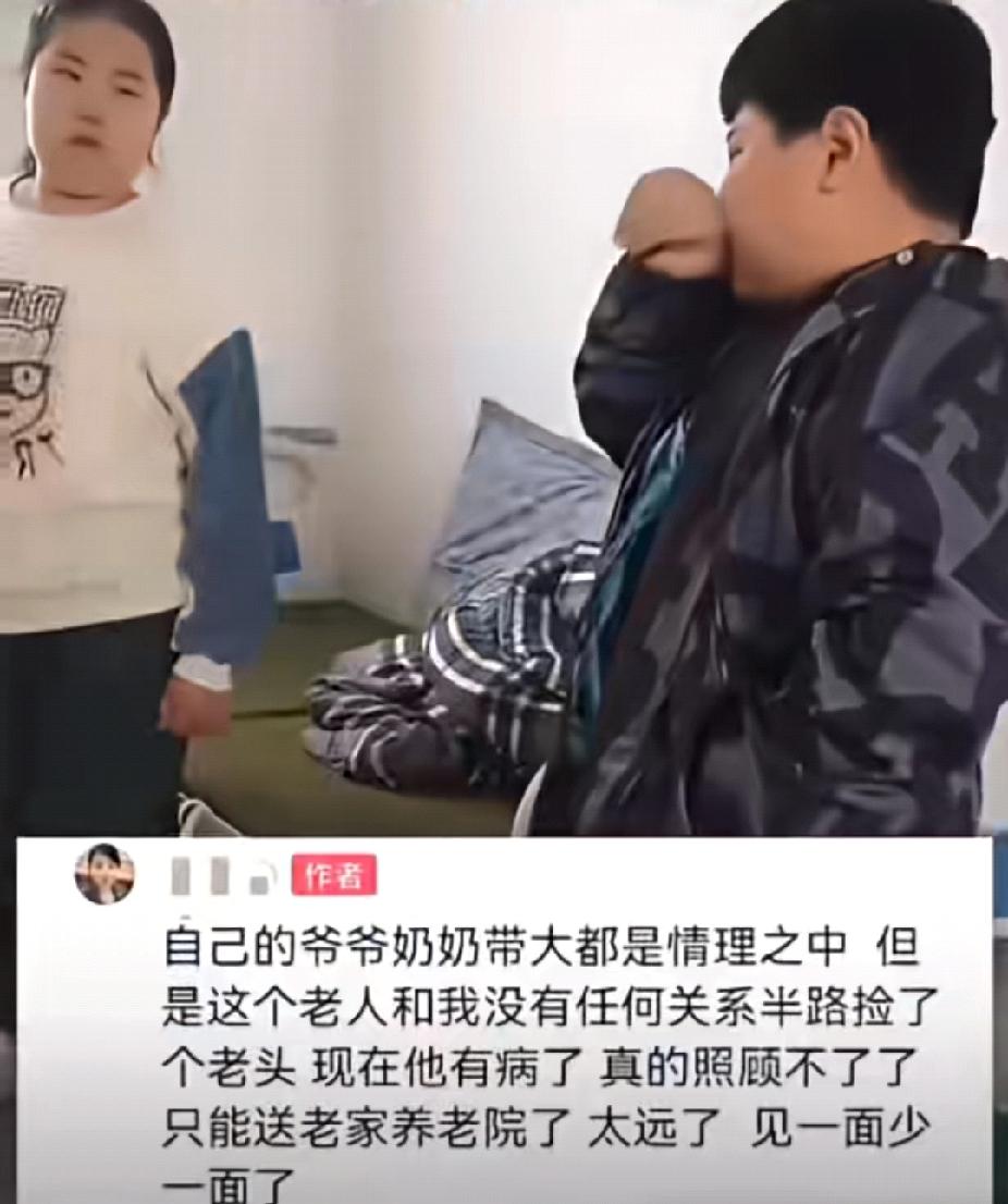 泪崩!流浪老人帮女子带孩子十年,老人生活不能自理,女子将其送养老院,俩孩子含泪下跪认爷爷! 养老院的房间里,老人坐在床上,被子盖得严严实实。女子带着一儿一女,站在老人的床边。 女子含着泪,哽咽着说:“是爷爷从小把你们带到这么大的。” 两个孩子跪在老人的床边,哭着给老人磕头,不是亲爷孙,却胜似亲爷孙的感情。 或许有人会谴责,老人免费帮你带十年孩子,最后你却把她送进养老院,这也太没有感恩之心了吧! 可是事实情况却不是如此! 九年前,老人是一个流浪汉,经常喝醉酒,醉倒在超市门口。这名山东女子看其可怜,经常给他送饭吃。 相处的久了,老人便留在了女子家里,帮女子看两个孩子,这一看就是十年。这十年里,有了老人,这个安稳的后盾,女子安心工作,管着老人的吃喝拉撒。 老人具体得的什么病我们不得而知。之前老人得过两次这种病,女子都花钱给老人治好了。 可是这一次的情况比较严重,女子实在无力负担高昂的医疗费。女子本想把老人安置在距离自己家比较近的养老院,可是老人不是本地人,养老院不收。 无奈之下,女子只能将老人送回自己老家的养老院,几百公里的距离,不能经常见面,或者说见一面少一面!床前女子泣不成声,她非常感激老人十年以来的帮扶,他带着两个孩子认下了这个爷爷。 孩子下跪的那一刻,在场的所有人都哭了!他们都在以自己的实际行动感恩着对方的付出。 十年前,老人无依无靠,生活浑浑噩噩。遇到女子好心接济,他感恩女子给自己的一口饭,自愿帮女子带孩子。自那以后的十年里,他重新有了家人。 女子对于老人十分信任,将自己两个孩子交给老人照顾,女子自然而然也承担着照顾老人衣食住行的责任! 十年来的朝夕相处,不是真正的家人,却早已有了超乎于血缘的亲情! 如今迫于生活的压力,女子只能将老人安置在距离自己几百公里的老家。她的内心既感激又充满了不舍,两个孩子面对这个没有血缘关系的爷爷,离开时也泪流满面! 看的人心里酸酸的,涩涩的,苦苦的。他们相互给了彼此最为温暖的十年,这份爱与信任,是他们人生中最为重要的养分!希望老人安度晚年,也希望他们在彼此的人生当中没有遗憾!山东 暖心正能量