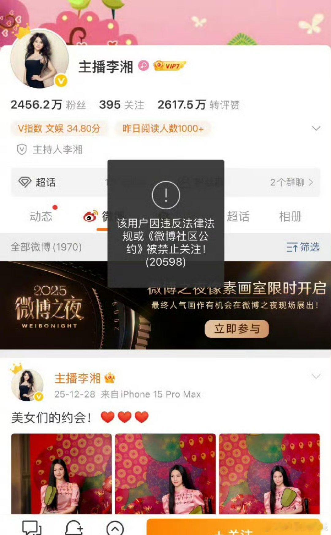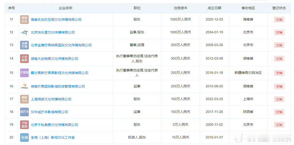 李湘全平台账号被禁止关注李湘名下超10家公司注销1月16日,网友发现知名主持人李湘在多平台的个人账号被禁止关注,粉丝累计超3000万。天眼查数据显示,目前李湘名下关联的20家企业,其中14家已注销,仅6家企业续存,注销比例高达70%。李湘在存续的企业中担任股东、执行董事或监事等职务,业务覆盖影视投资、企业管理等领域。(封面新闻)另外,已注销的14家企业多集中于文化娱乐、商务服务领域,且李湘曾在多家注销公司担任法定代表人执行董事或总经理。 (广州日报)截至目前李湘女儿王诗龄的社交账号未受影响。公开资料显示,李湘毕业于中国传媒大学,毕业后先后主持湖南电视台《晚间新闻》《灯火阑珊》等节目。1997年,主持湖南卫视《快乐大本营》。1998年,主持中央电视台《东西南北中》。2003年,李湘获得全国卫视最受欢迎主持人第一名;三次评为“最受欢迎主持人”称号。2004年11月,李湘正式离开湖南卫视《快乐大本营》。2013年8月,李湘出任深圳卫视副总监,2016年3月,加盟奇虎360,任职副总裁及首席内容官。5月,被正式任命为360娱乐总裁。2023年8月,李湘发文透露已经退休。