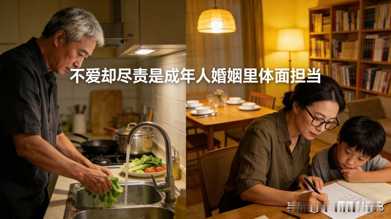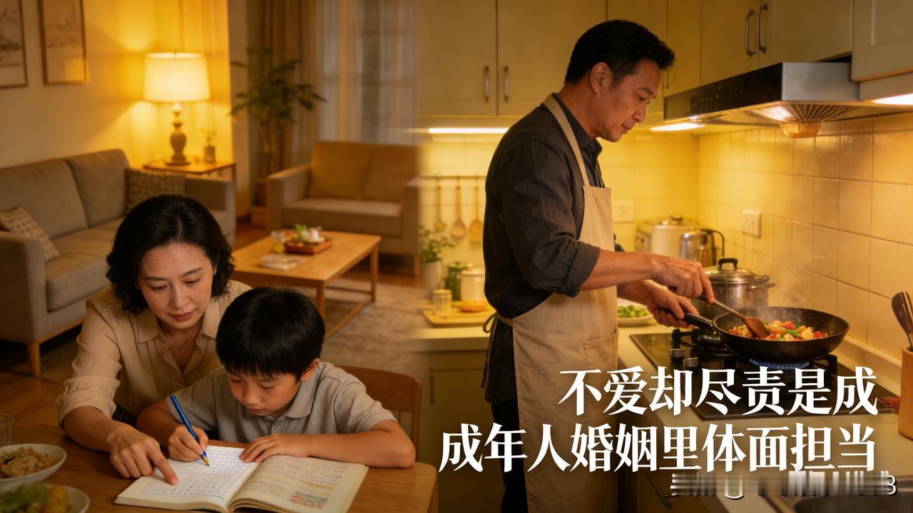 被同事一句话戳中了痛处 ——“你明明不爱妻子,却把丈夫责任尽到骨子里”。恍惚间意识到,自己 28 岁因失恋和年龄压力仓促结婚,这些年确实在 “搭伙过日子”。《民法典》里写得清楚,夫妻有互相扶养的义务,有平等抚养子女的责任,这些是法律规定的 “必须做”,而非感情驱动的 “想做”。 “搭伙” 二字常被误解为冷漠,可对我们这样没感情基础的婚姻来说,这反而是成年人最清醒的选择。就像老年人丧偶后搭伙共度余生,离异者带着孩子重组家庭,不领证先同居,彼此管好财产和责任边界,反而比空谈爱与情更实在。 “爱” 的字典里有千种释义,可对我这种 “责任大于感情” 的人而言,能守住 “互相尊重、不背叛” 的底线,把孩子抚养成人,安安稳稳过好每一天,或许就是婚姻最真实的样子。同事的话让我明白:不爱却尽责,恰是成年人婚姻里最体面的担当 —— 日子是给孩子和自己过的,爱可以晚点来,但责任必须先立住。