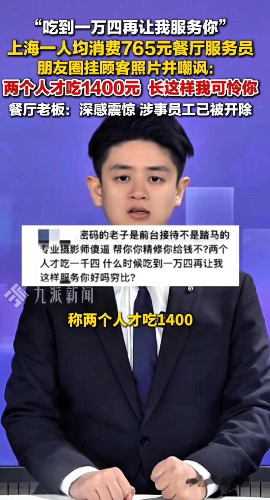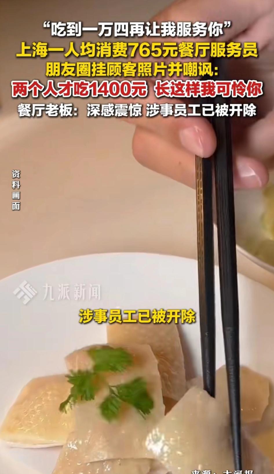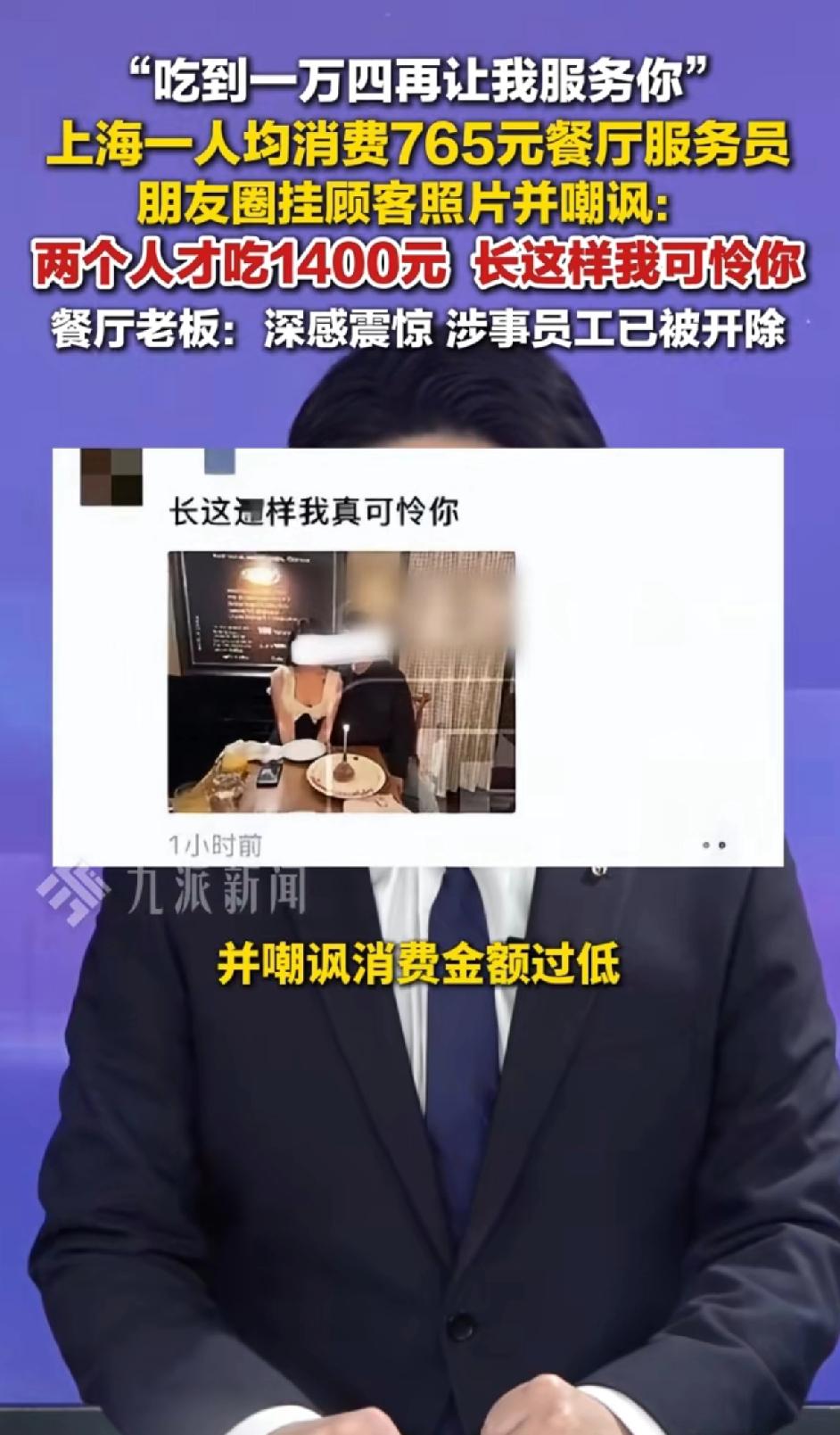 上海一餐厅服务员朋友圈挂顾客照片并讽刺:俩人才吃1400元,吃到14000元再让