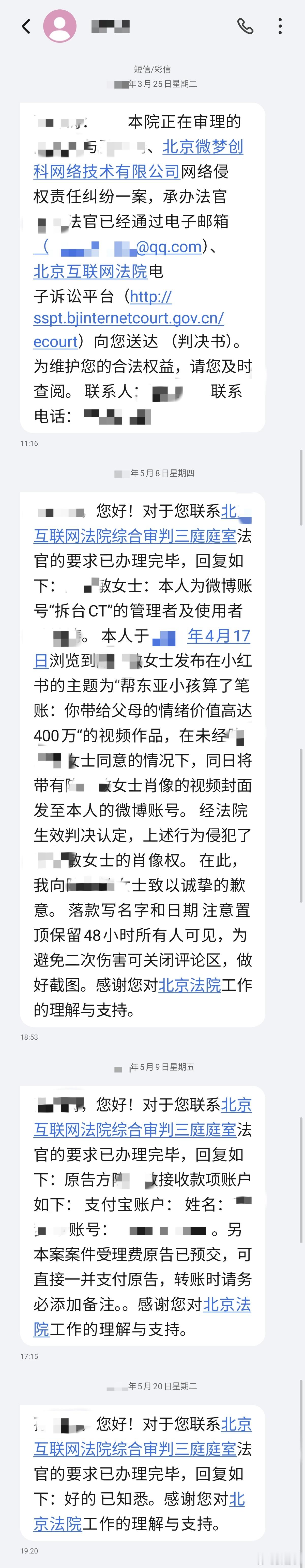 女子向出轨丈夫道歉视频走红另外,一般来说,道歉文案要经过法院审核。哥们的亲身经历是,自己先交一份,法院改完后会发回一份最终版。图2是哥们当时收到的短信。哥们当时还因为把自己名字抹了,被法官电话要求重新道歉。不知道这姐们到底是啥情况。她这种道歉方法,理论上讲是已经违法了。只要男方通过法官要求,立马就要改的。不知道他为什么会这么后知后觉。