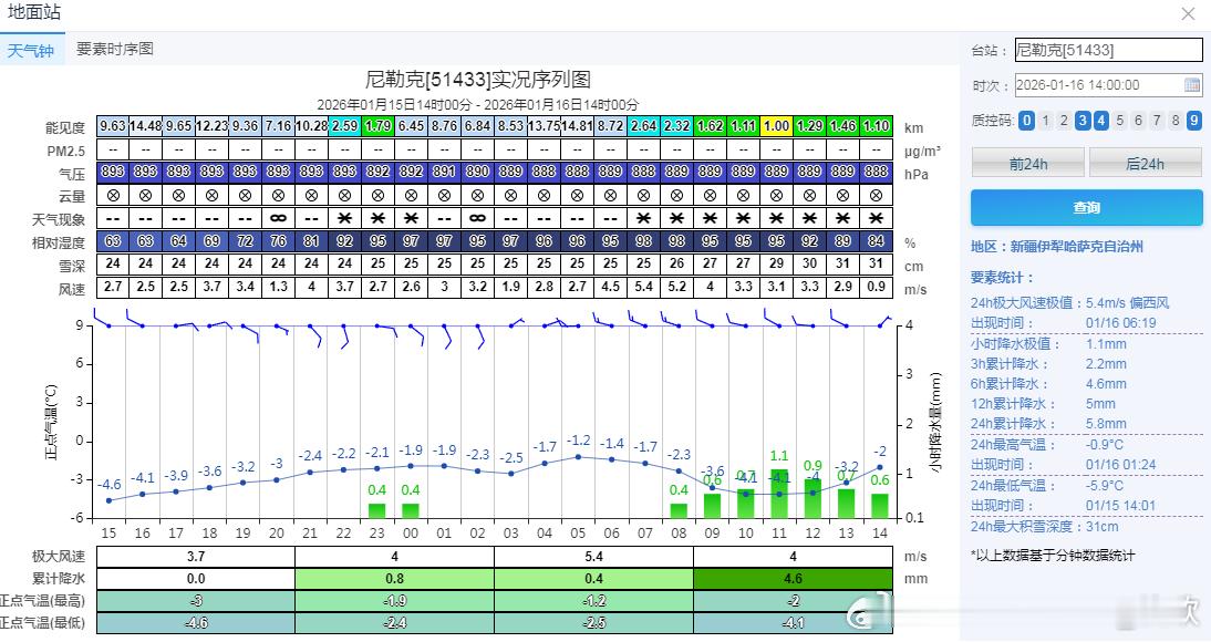 【降水】今天白天的雨雪依然不多,新疆伊犁河谷的降雪相对明显。尼勒克今天以来的降雪量已经达到了大雪级别,14时积雪增厚到31厘米。今天下午到明天中午,伊犁河谷和天山沿线还有降雪。同时贵州广西湖南的降雨会发展增多。冷暖气流都开始发力,18日-20日我国将有大范围雨雪过程。