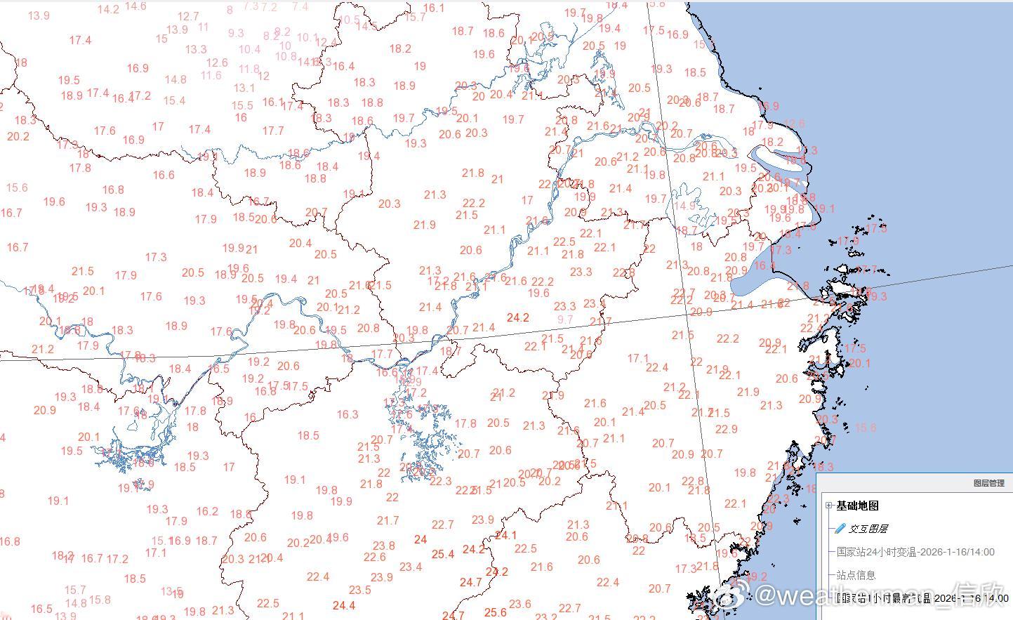 【气温走势分化】今天已经有冷空气渗透南下,内蒙古山西河北山东河南部分地区降温超10℃。山东淄博降16.8℃、内蒙古正蓝旗降16.2℃、河南内黄降15.7℃、河北邢台降15.4℃、山西阳泉降14.4℃,为各自省区14时降温最强站点。此外济南降15.2℃、郑州降13.3℃,近期偏高的气温被打回了原形。今天南方地区的气温维持高位,多地还在20℃以上。截至14时最高气温,合肥21.8℃、南京20.6℃,均打破当地1月中旬最高纪录。而且两个城市,连续3天超20℃,在1月观测史上,首次出现。