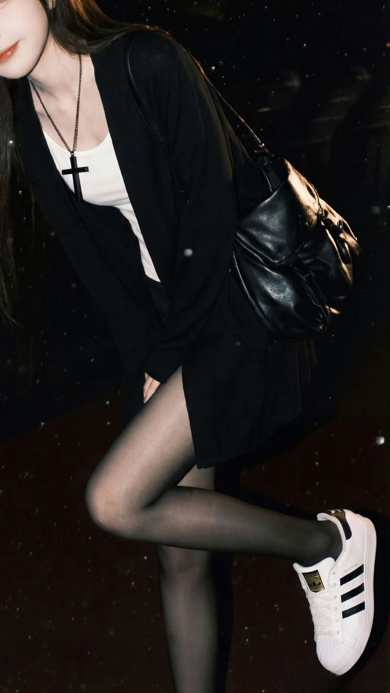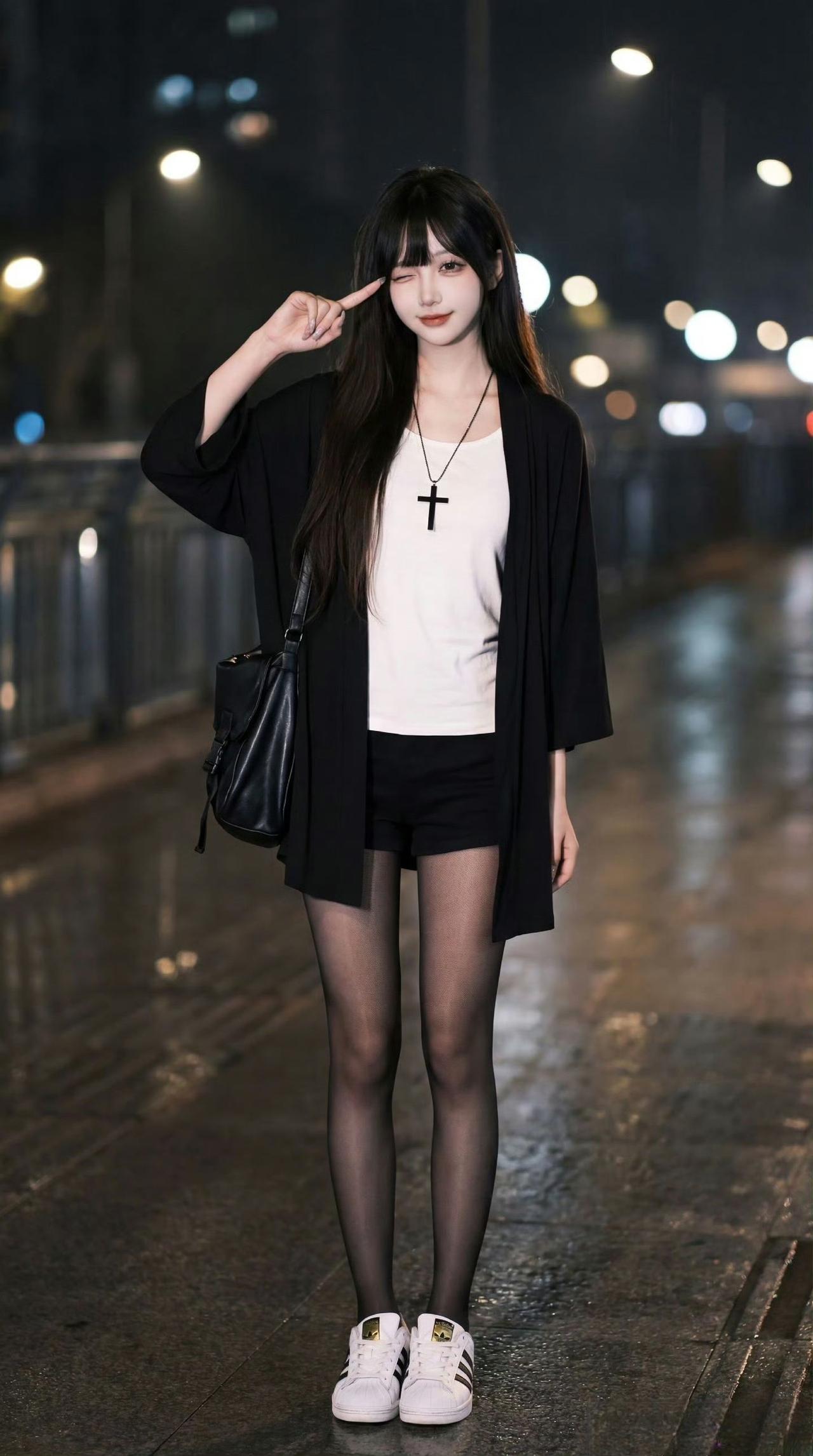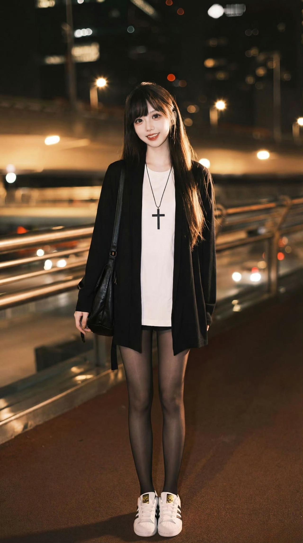 这套穿搭是甜酷松弛的黑白风,把休闲感和轻熟细节融合得很适配。黑色长款开衫自带松弛随性,内搭白T+黑短裤,露出腿部线条注轻熟感;十字架项链添个性元素。 搭配白运动鞋,让造型更显松弛;黑色大包强化实用感,充分展现穿着者甜酷松弛的轻熟魅力。黑白色调穿搭 黑白配穿搭美学