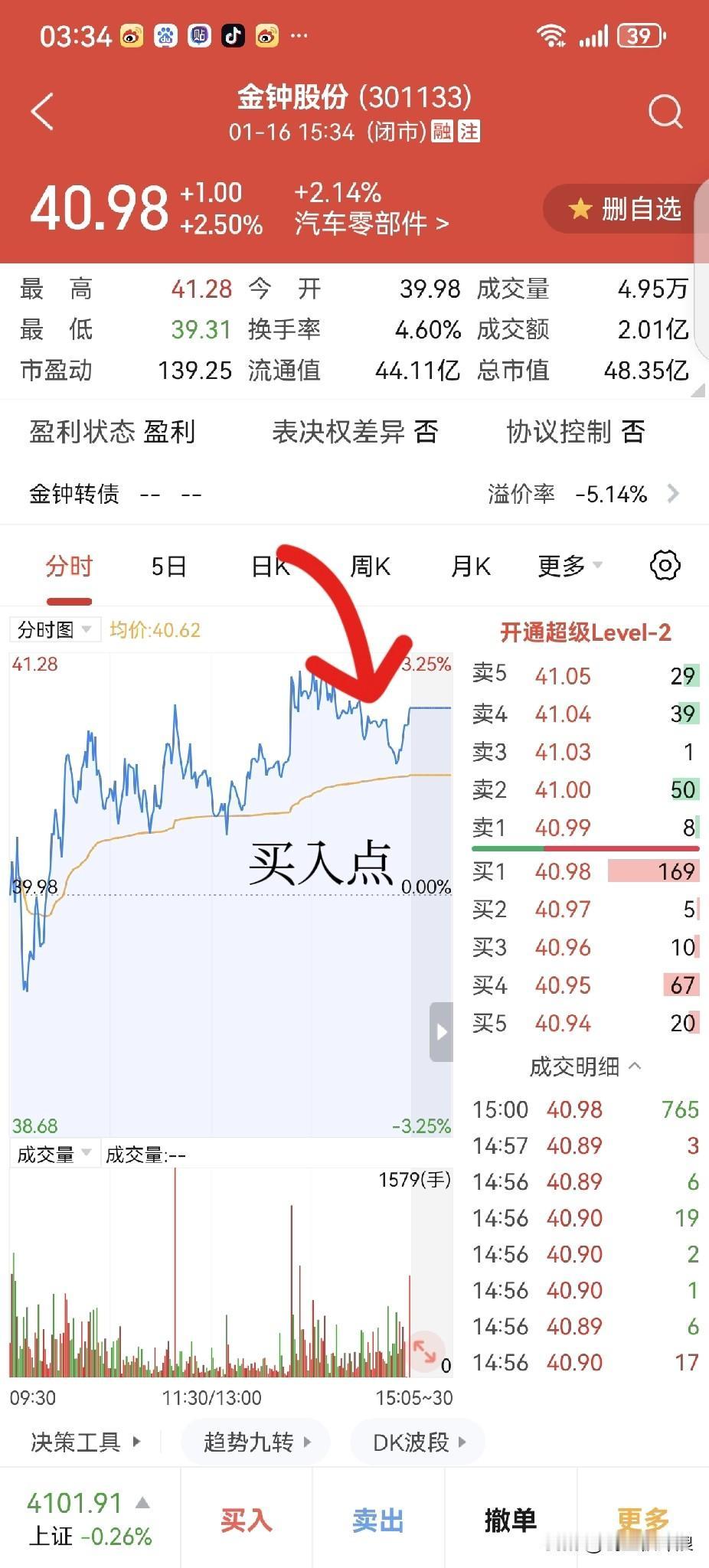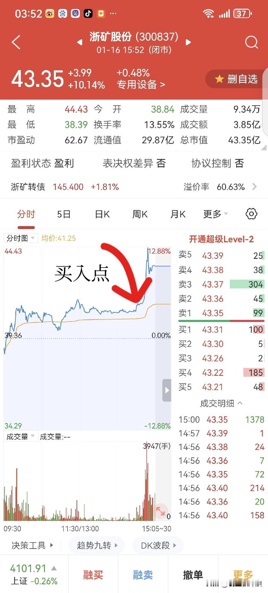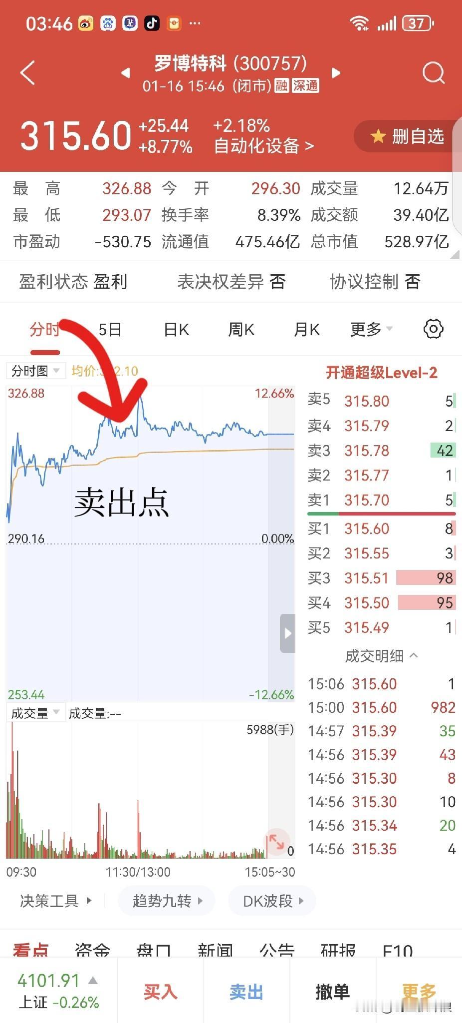 【一个月翻倍!创业板+科创板实盘挑战 :第3天】——买对才有收益,会卖才能挣钱! 总 收 益 率:+19.16%; 当日收益率:+7.91%。 今日操作: 1、卖出: ①罗博特科:买入价289.87,卖出价315.35,收益率:+8.8%,持股1日。 ➹卖出理由:突破历史新高,没出现卖点,但量能放大明显且乖离过大,落袋为安! 2、未操作: ①赛微电子(融):买入价62.82,收盘价61.03,收益率:-2.0%,持股2日。 ②鼎泰高科:买入价160.38,收盘价157.89,收益率:-1.56%,持股1日。 3、买入: ①金钟股份:买入价41.02,收盘价40.98,收益率:-0.15%。 ➹买入理由:日线周线都是缩量上涨均线多头,股价突破前期大阴实顶,创短期新高! ②浙矿股份:买入价41.40,收盘价43.35,收益率:+4.50%。 ➹买入理由:突破前期大阴实顶,分时横盘抗跌,有创新高机会,大胆买入! ③东杰智能:买入价21.80,收盘价竞价买入,收益率:+0%。 ➹买入理由:突破下跌高点连线后回踩反弹,今日形成阳包阴形态。 创业板 科创板 ☻操作套路: ——14:30用自创的公式选股,全仓+融资买入;次日10:00前卖出,个别盯盘持仓! ☻买卖形态: 1、买入形态:反包或突破前期大阴实顶。 2、卖出形态: ①大跌形态:低开低走的,反弹不过均线的,趁早卖。 ②大涨形态:高开高走的,回落不破均线的,盯盘找卖点。 ☯声明:纯个人记录,不构成任何投资建议。