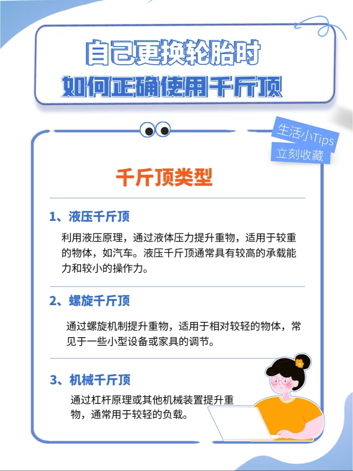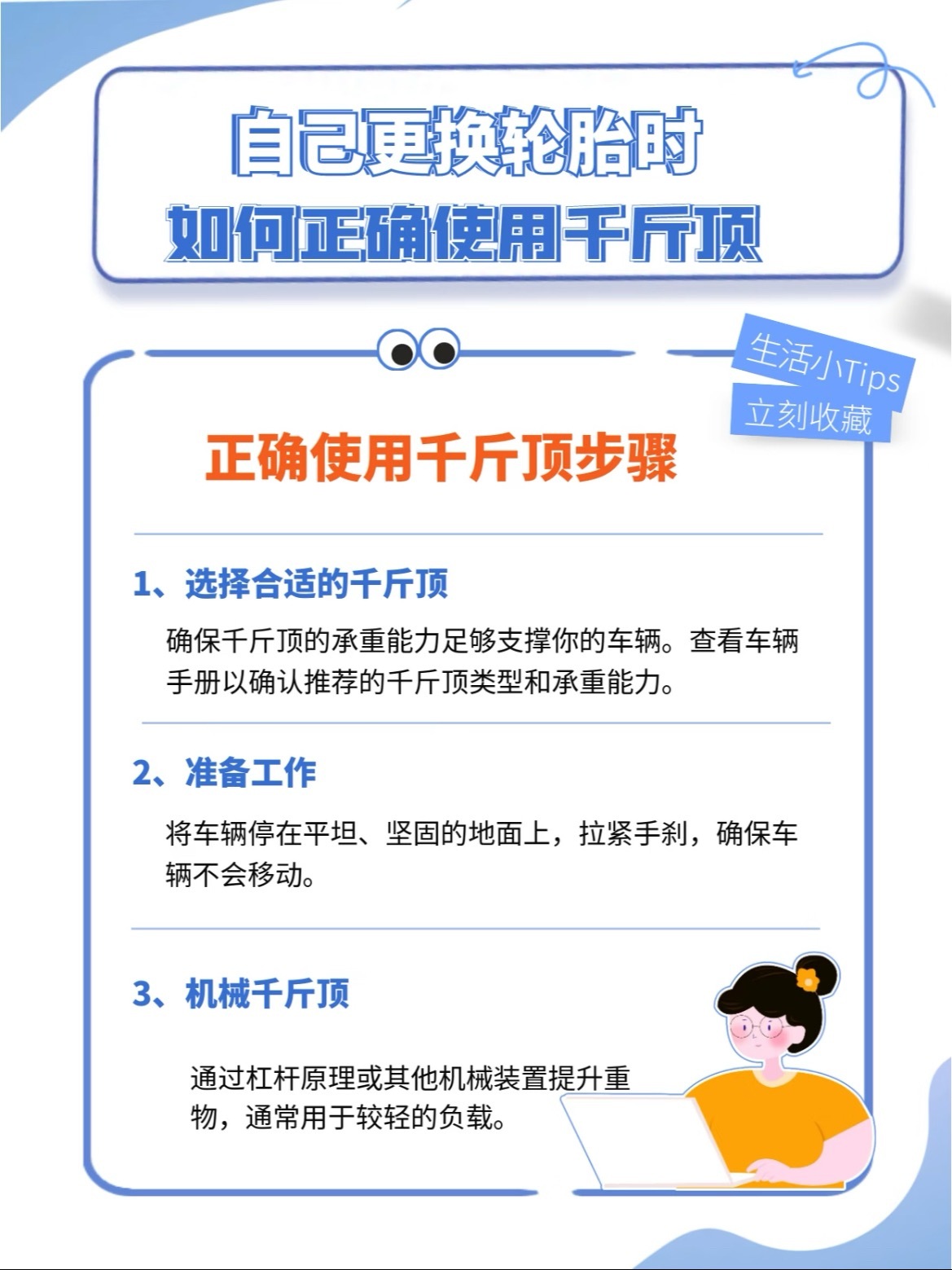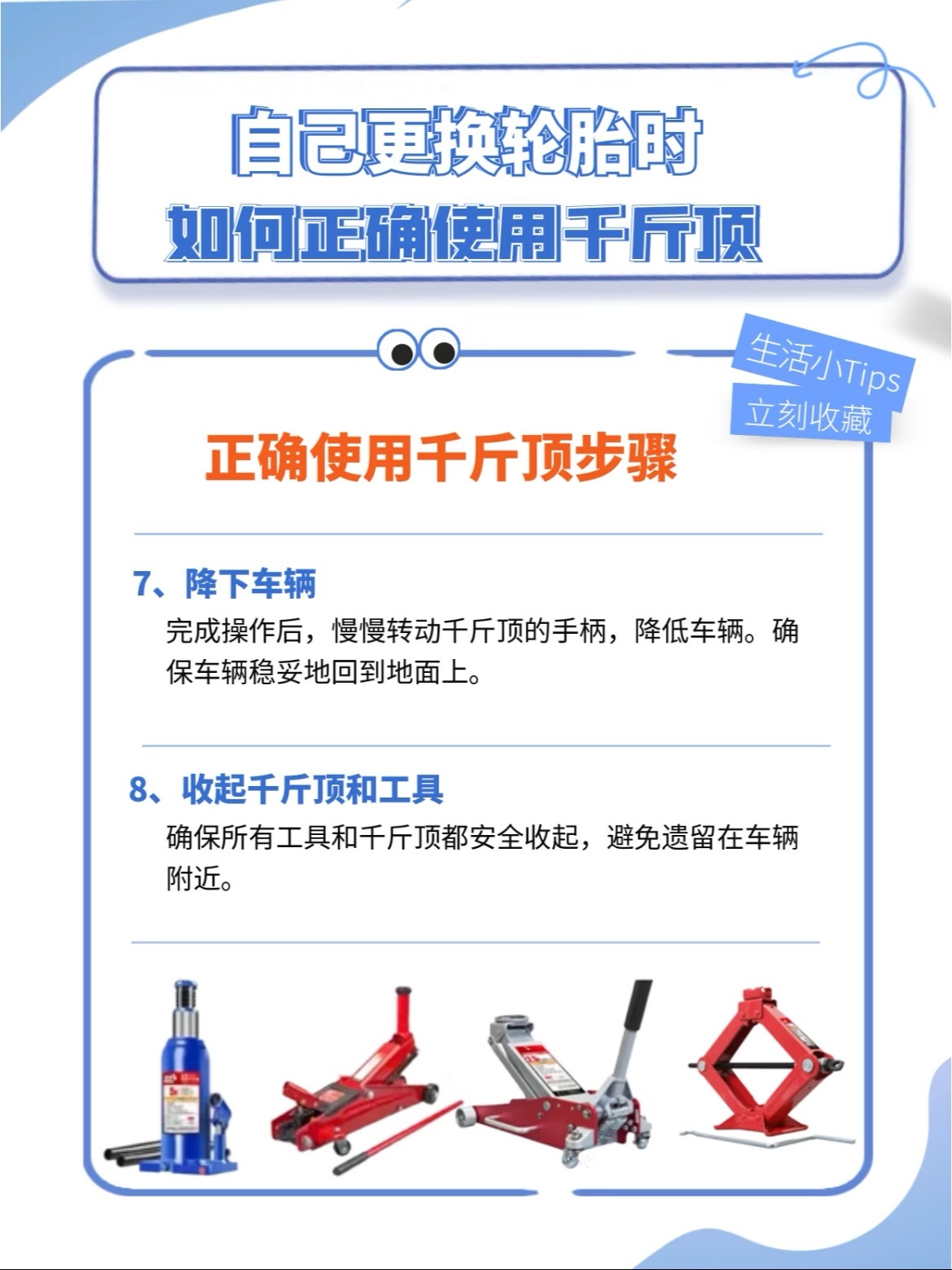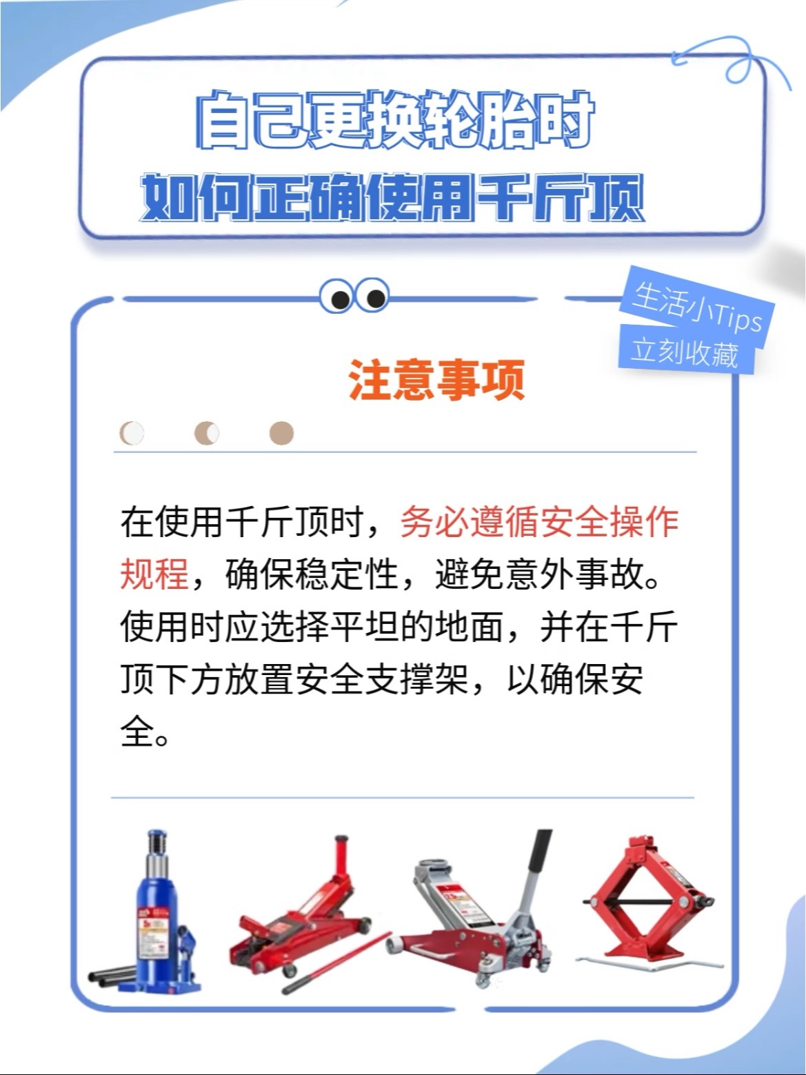 路上爆胎,自己动手换备胎其实不难但用错千斤顶真的很危险!🛞 首先,分清你的千斤顶大部分家用车配的是液压千斤顶,越野或SUV可能配螺旋千斤顶。一定要先看车辆手册,确认千斤顶最大承重必须大于你车的重量!⚠️ 关键安全步骤,一步都不能省:1️⃣ 停车在 平坦硬实 地面,拉紧手刹,挂P挡/挂1挡,车轮前后放砖石固定2️⃣ 找到 底盘指定支撑点(通常在车门下方,用手能摸到凸起或凹槽),千万别顶错位置!3️⃣ 将千斤顶对准支撑点,确保 完全垂直、稳稳接触4️⃣ 缓慢摇动手柄抬升车辆,直到轮胎离地约2-3厘米即可5️⃣ 立刻在车底放上备胎或支撑架,以防千斤顶意外失效6️⃣ 换好备胎后,先稍微拧紧螺丝,再缓慢降下车身,最后用扳手 对角线顺序 全力拧紧7️⃣ 收好工具,尽快去补胎,备胎别长跑!希望大家都用不上,但真遇上了也别怕,按步骤来,安全第一!汽车大v聊车
