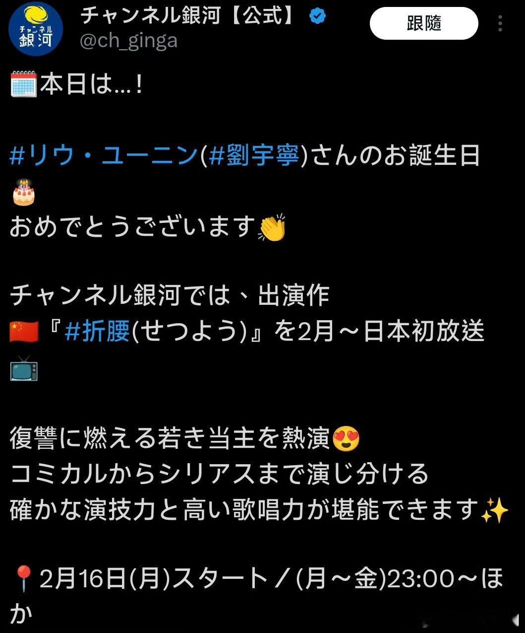 刘宇宁《折腰》2月日本首播!频道用词,刘宇宁先生其出演的作品