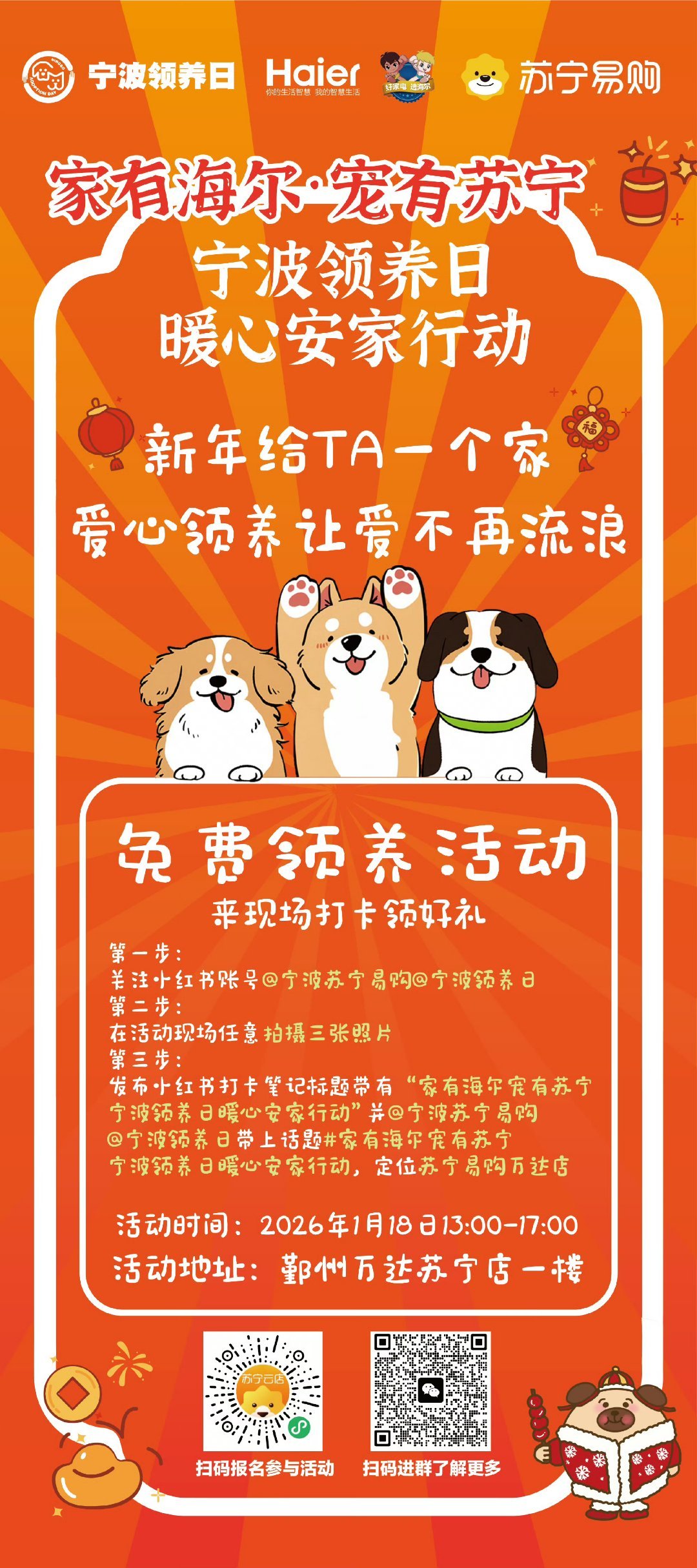 宁波领养日周日暖心安家活动 周日暖心安家活动!!🥳🧧1月18日下午13:00-17:00,“家有海尔·宠有苏宁”宁波领养日暖心安家行动登陆苏宁易购鄞州万达店一楼👀40+只曾流浪,如今超健康的汪星人猫星人,等你来抱走!🐶🐱感谢您选择领养代替购买~🍀码住速来~~ 寻美浙江