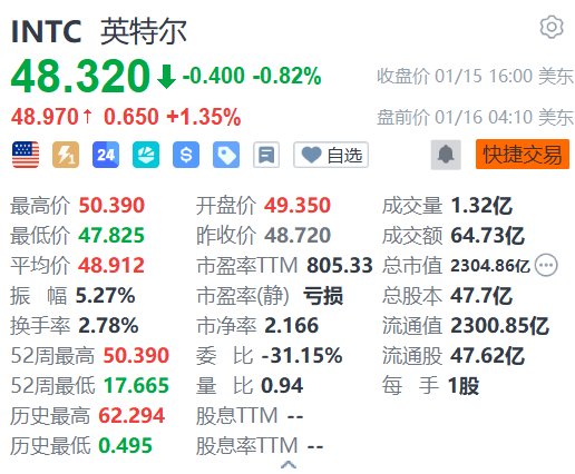 英特尔(INTC.US)盘前涨1.35%,报48.97美元。消息面上,花旗集团周四上调英特尔的评级,由原先的“卖出”调升至“中性”,目标价设定为50美元。花旗分析指出,英特尔将从台积电先进封装产能紧张的局势中获益。此外,英特尔“在政府支持下,拥有吸引代工晶圆客户的独特机会窗口”。“相信随着英特尔18A-P/14A工艺良率提升,在后端环节,英特尔将率先收获人工智能专用集成电路(像TPU这类)所带来的溢出效应,而后这一利好会延伸至前端代工客户领域。”