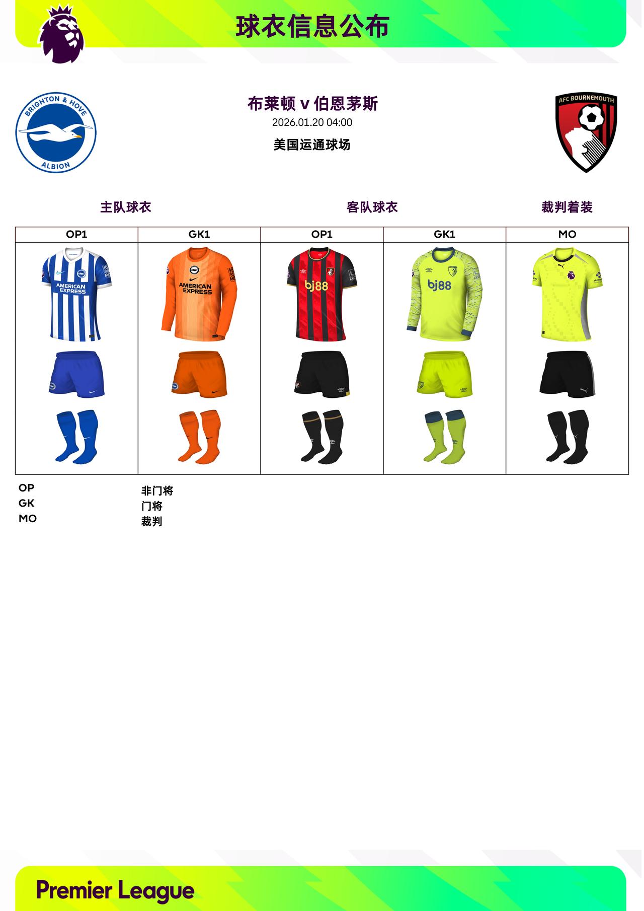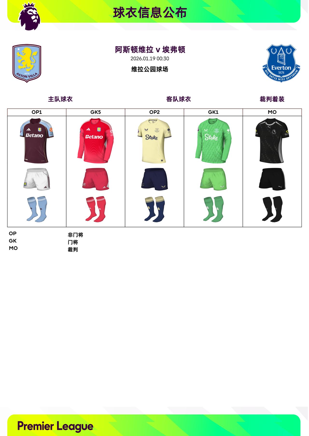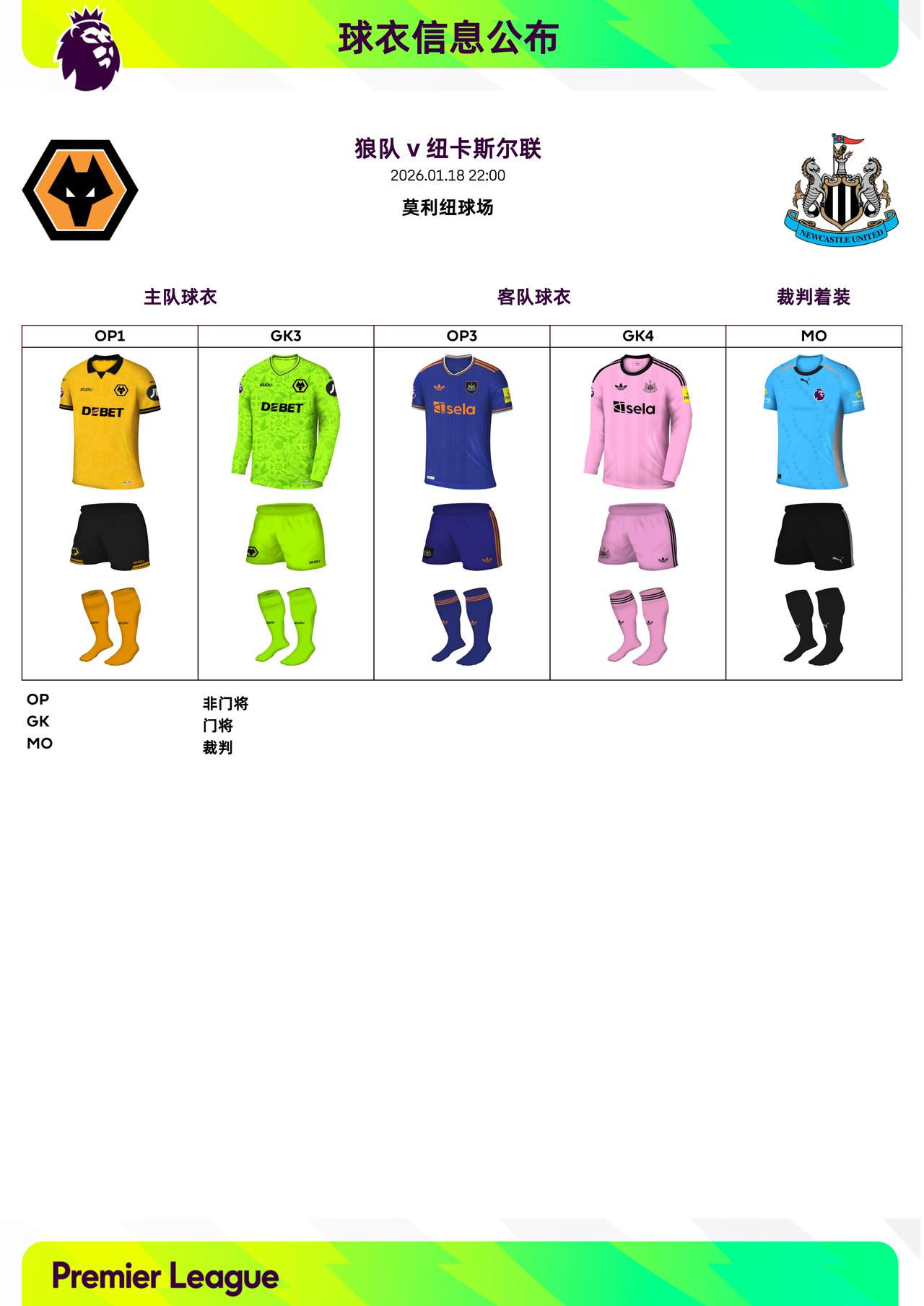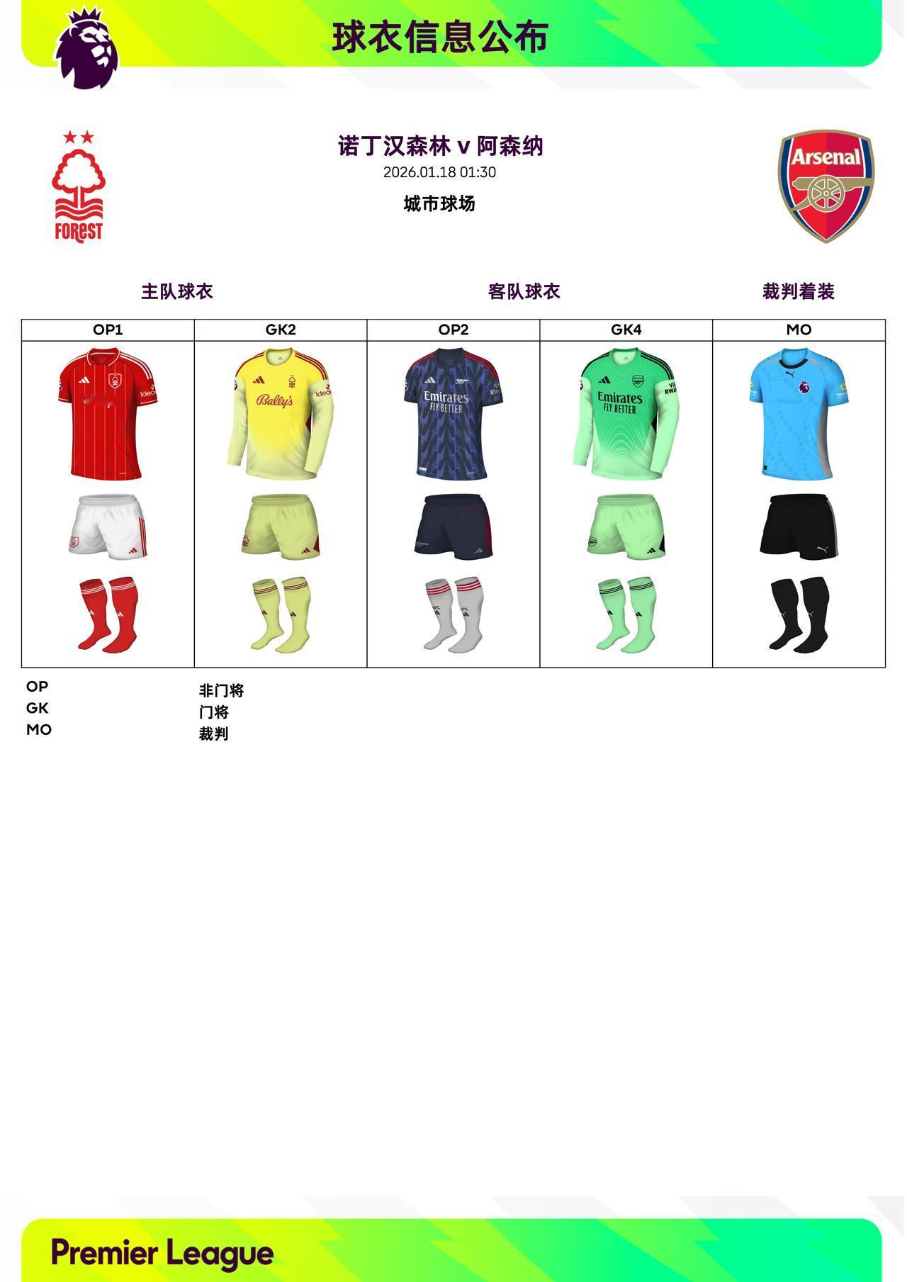 2025/26赛季英超联赛第22轮球衣信息: ◉ 焦点战——曼联 v 曼城,双方均穿主场球衣
