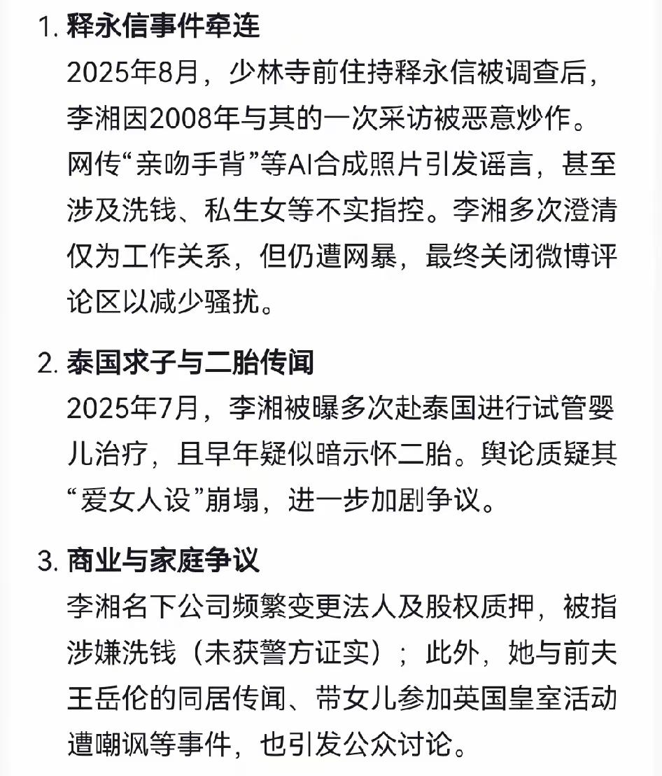 李湘究竟怎么了?李湘的财富是怎么来的,她自己知道,何超琼的财富是怎么来的,她自己知道,何超琼人家从骨子里就看不起李湘,何必自讨没趣。 洋相出够了,该收拾收拾了,就一个主持人怎么那么多钱? 他爸省高院院长,她妈妈九十年代就是奥迪汽车代理商,她很早就在北京投资房地产,中国最早的带货主播。 有钱人很多,但是谁像她一样:一顿早餐吃了多少钱。你吃就吃了,还要晒出来,和那个闫某晶一样! 只见她晒富,没听说她捐款帮穷人,这样子的人要封杀,把年轻带坏了。 对社会没有一点贡献,误导年轻人三观,如果人人没有信仰,她对她女儿确实是教育到位。不过多年来,确实不见她捐款,或者加入慈善活动。只能说有小爱,没有格局和大爱。 巨额财产请说明来源,如果做生意赚的,请拿出缴税凭证!