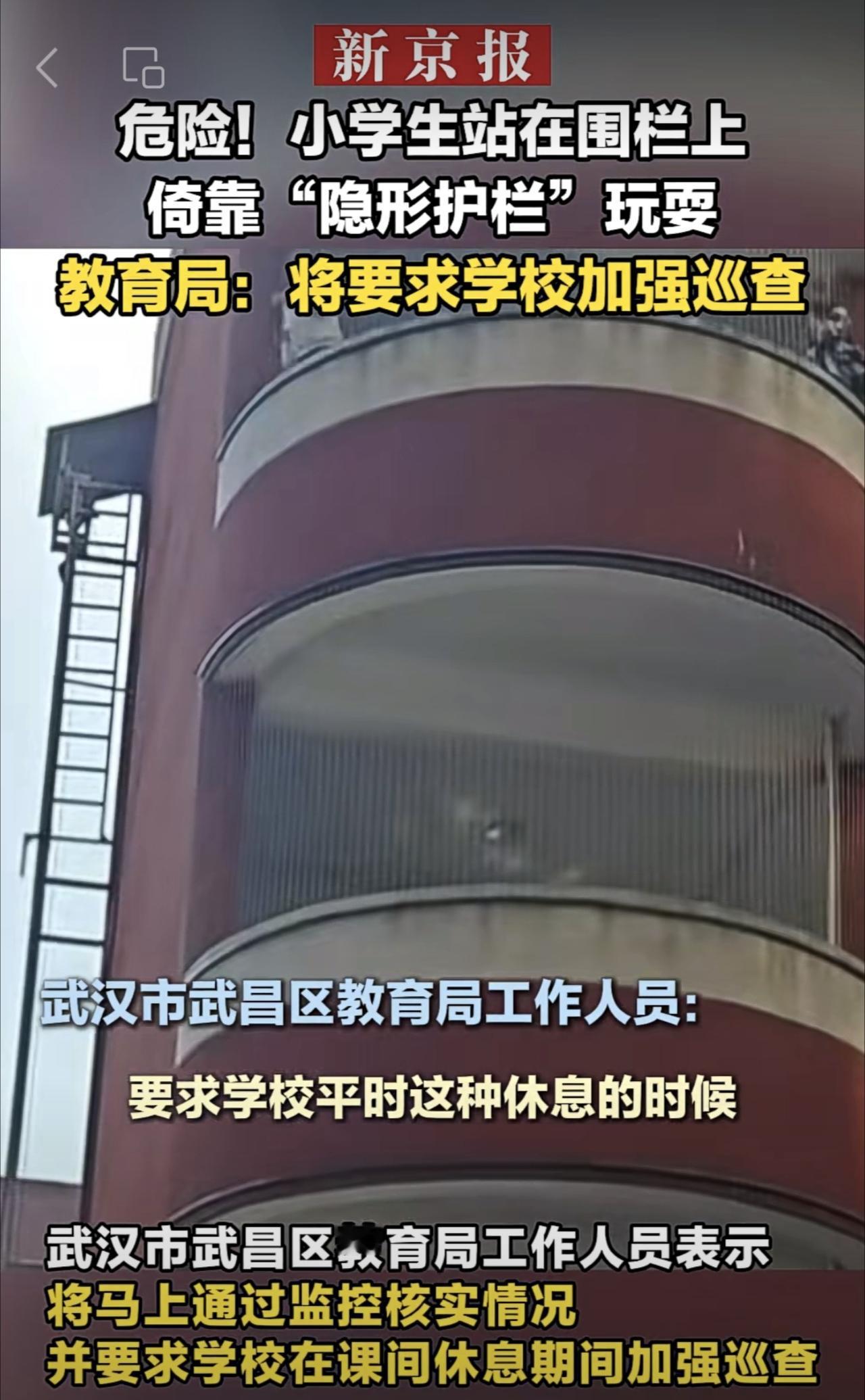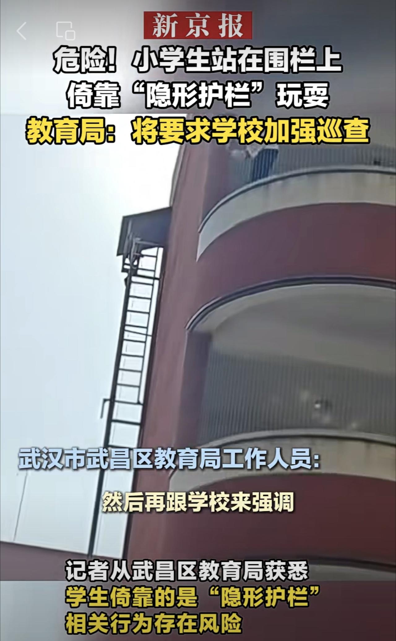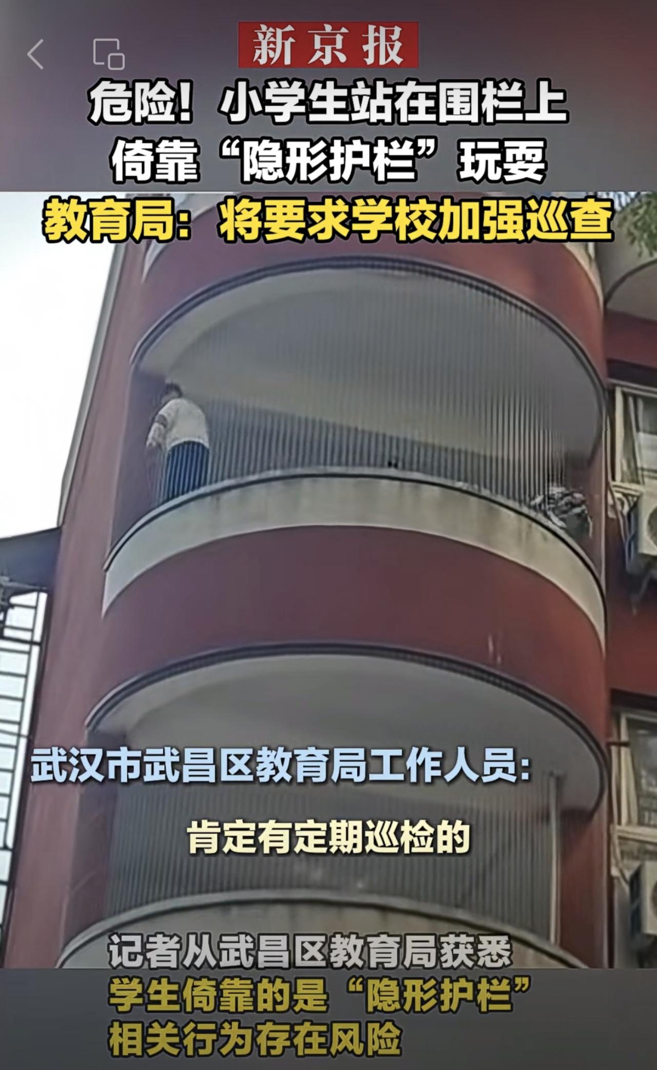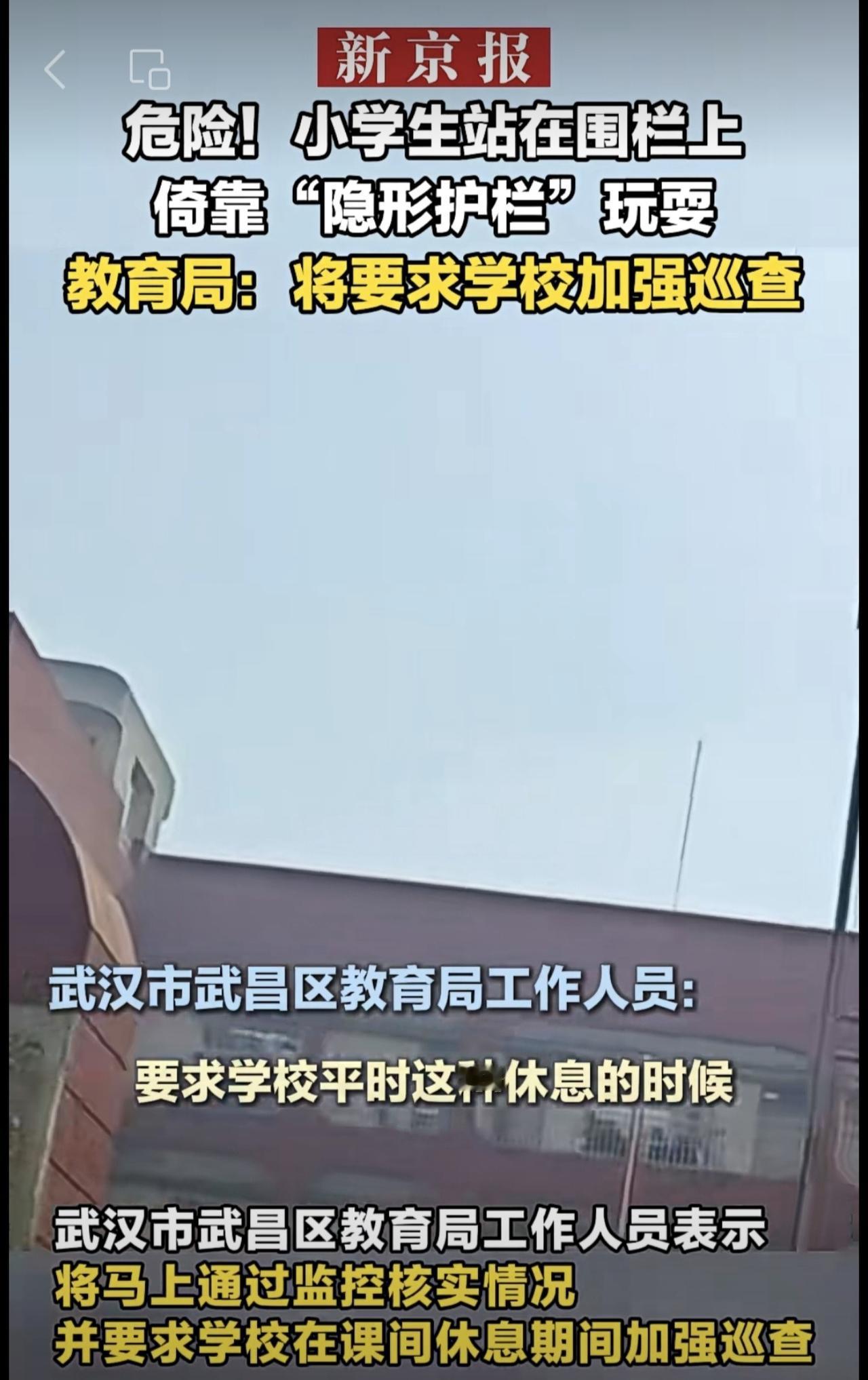 危险!小学生站在围栏上倚靠“隐形护栏”玩耍 教育局:将要求学校加强巡查。