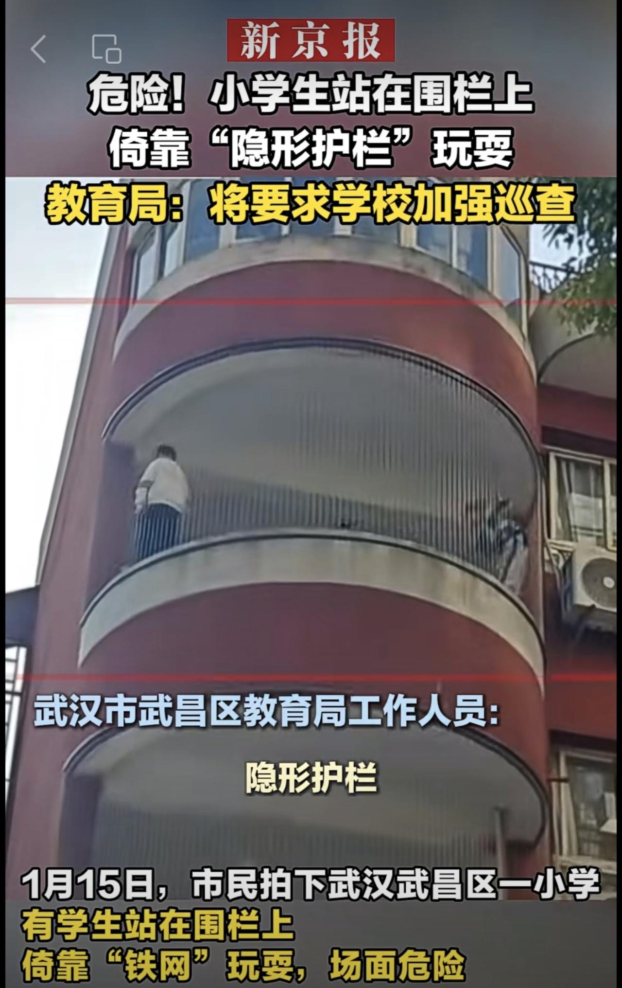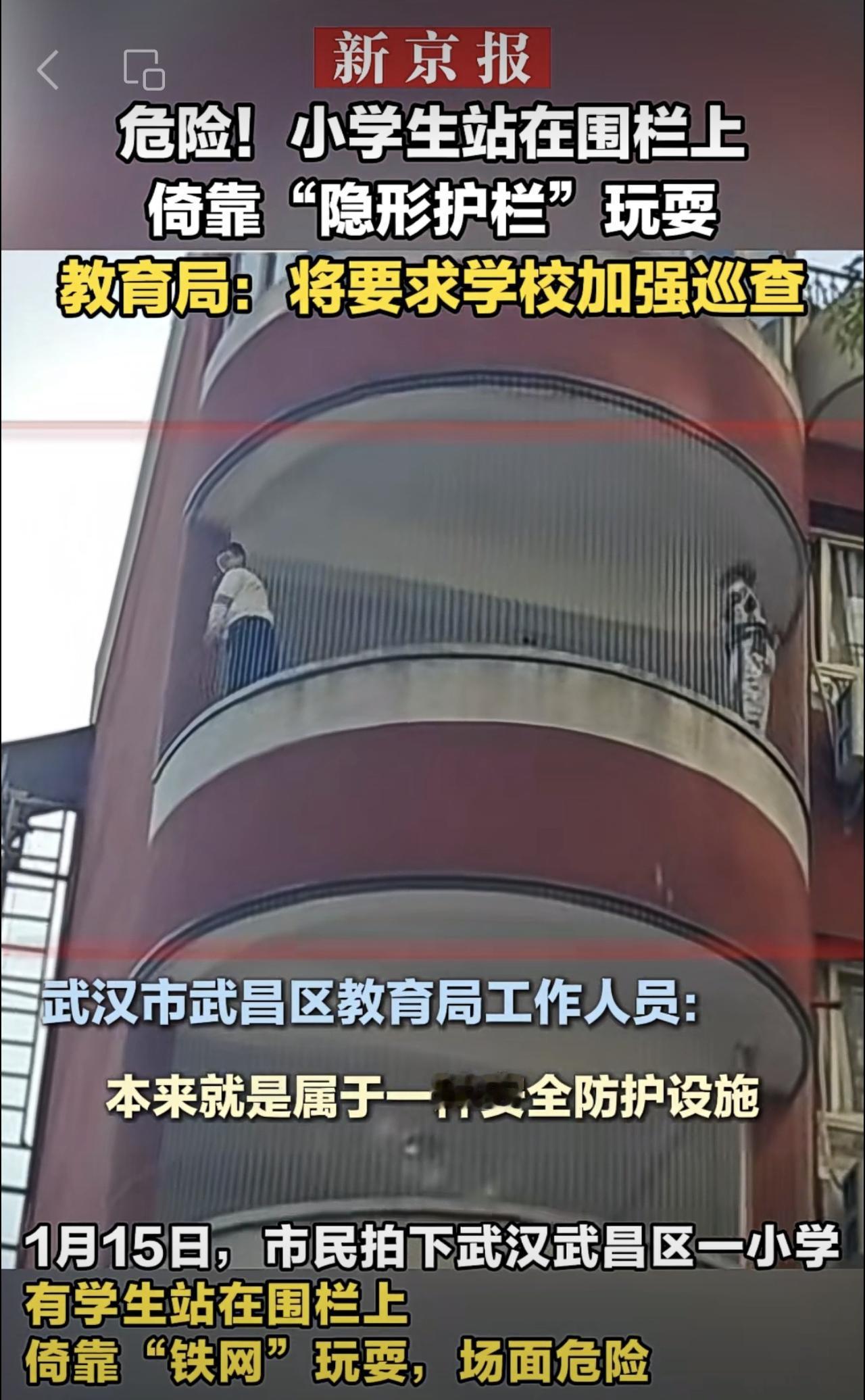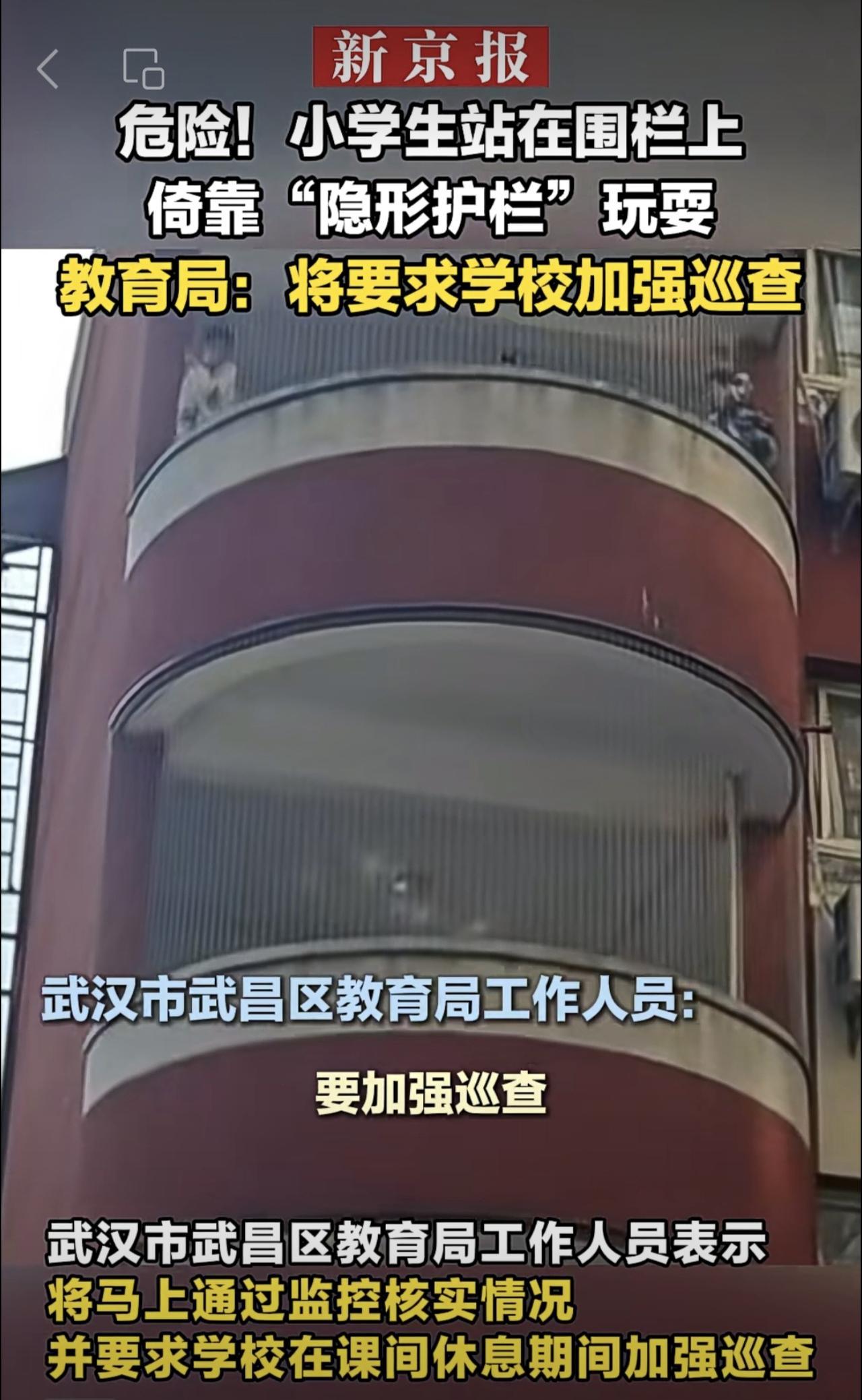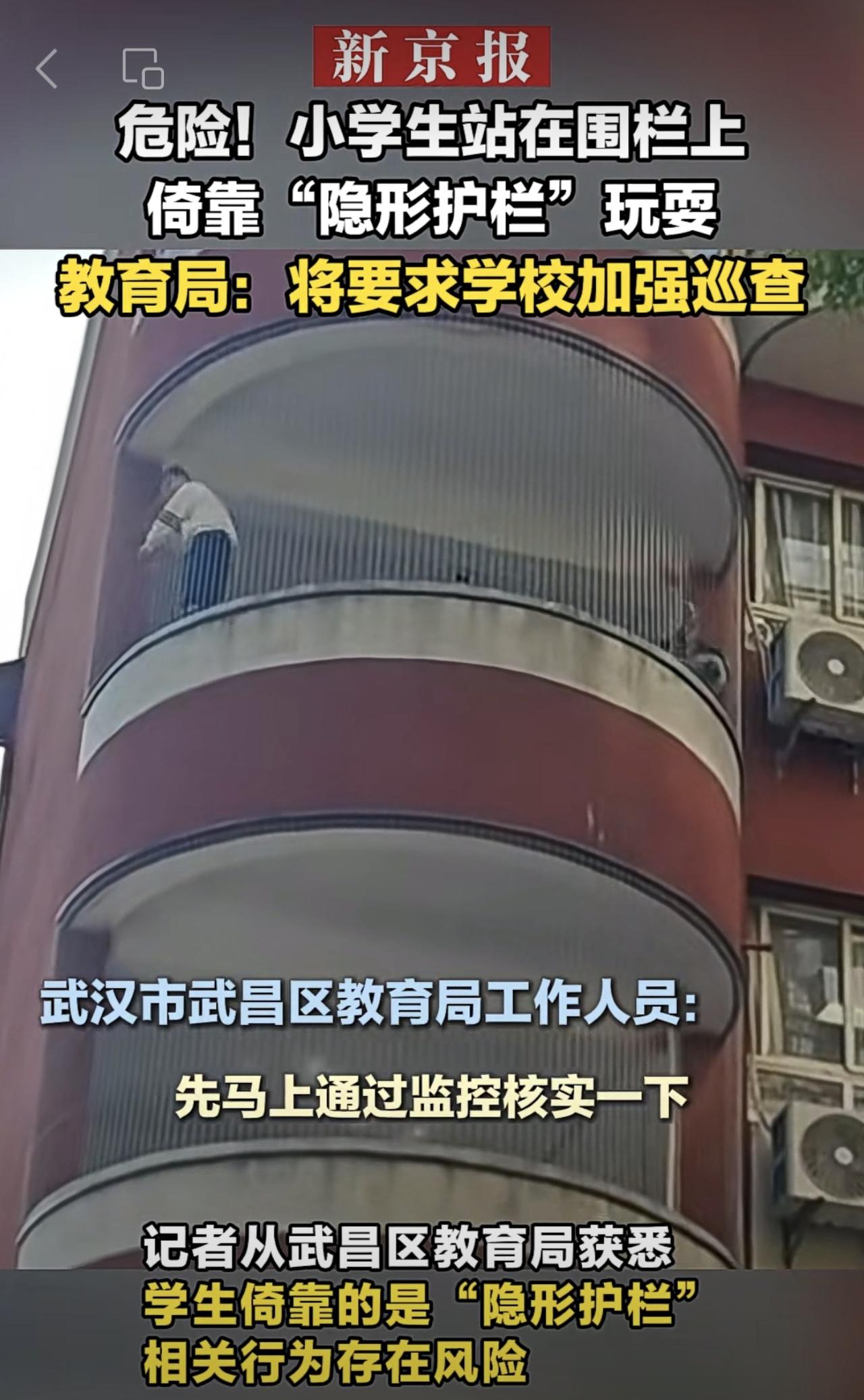 危险!小学生站在围栏上倚靠“隐形护栏”玩耍 教育局:将要求学校加强巡查。