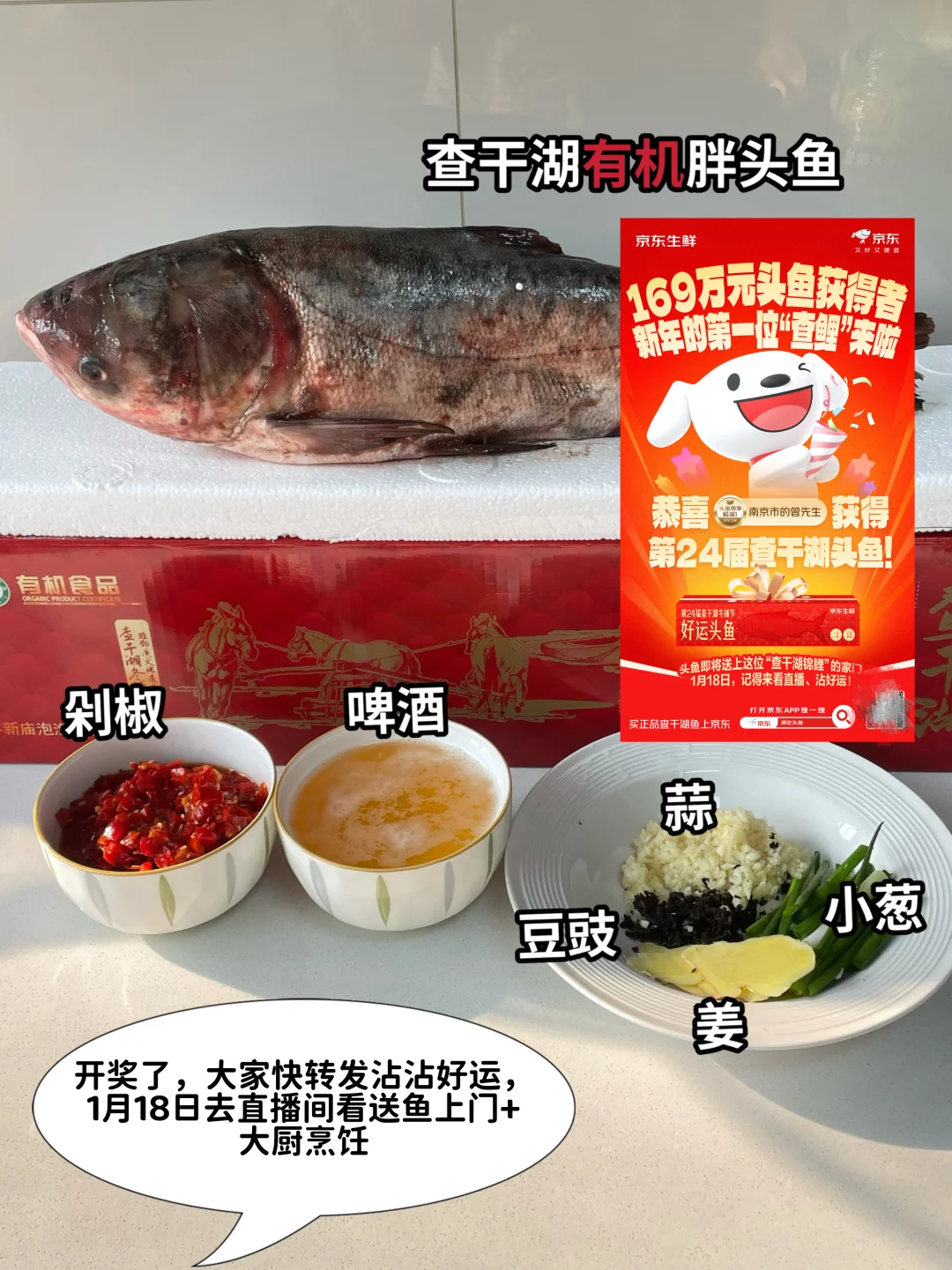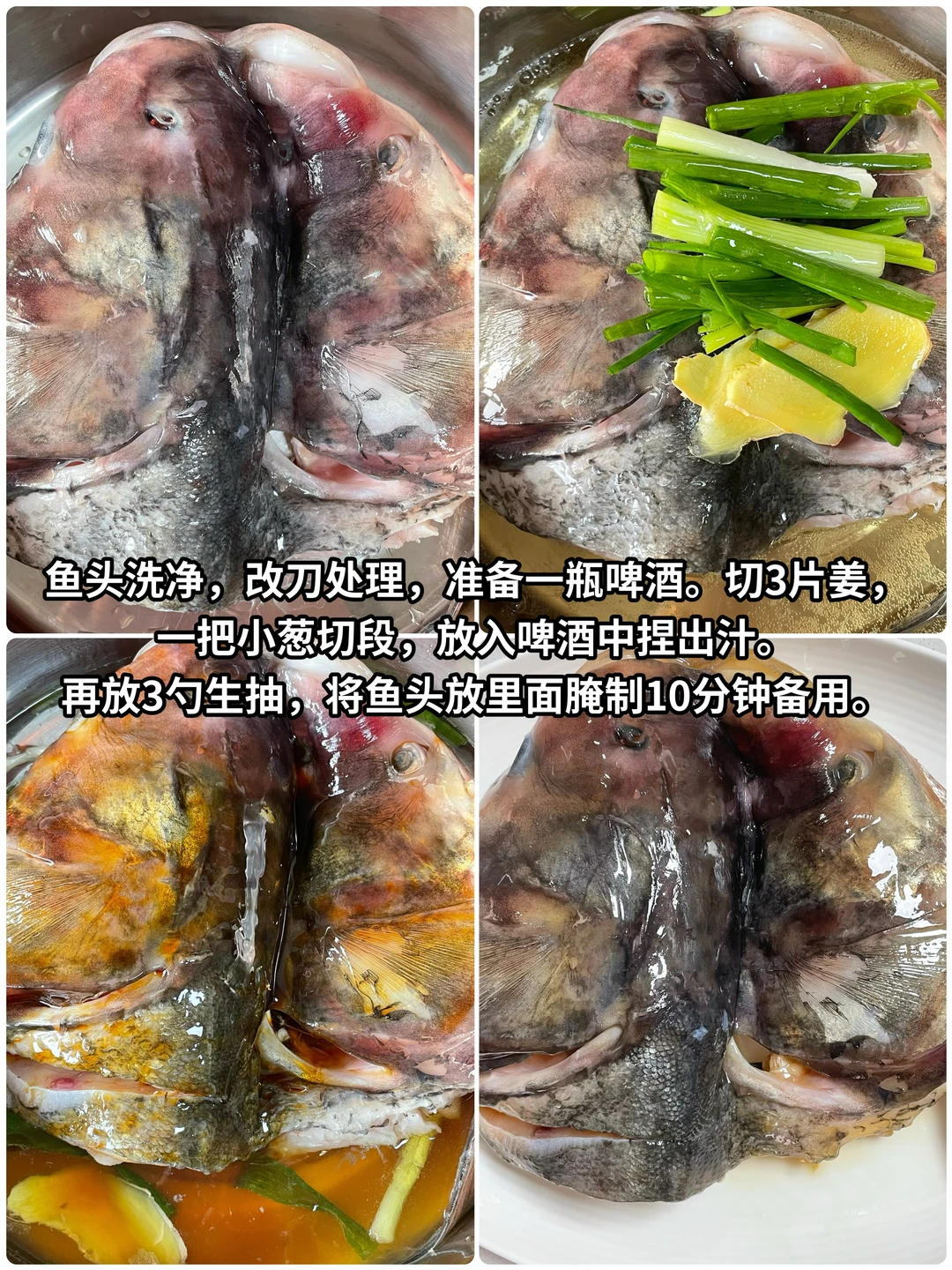姐妹们,谁家的年夜饭上都离不开鱼吧?今天给大家出一个剁椒鱼头,这个菜好吃又好看,还下饭。喜欢的姐妹可以尝试做一下。今天用的鱼是我从京东上买的查干湖鱼。买正品查干湖鱼上京东。搜索“查干湖888“进入活动会场,更多查干湖好鱼正享年度好价。京东抽169万元查干湖头鱼的活动已经开奖啦,快来看看是哪个幸运儿会获得这份头彩呢?18号还会去中奖用户家里送鱼烹饪呢!感兴趣的姐妹们可以转发起来,一起沾沾好运气。另外京东生鲜年货节也已经正在进行中,头彩好年货满99打8折,而且好价的车厘子已经加入年后货节折扣清单,快点来带回家吧,好价等你抢! 🌶️食材:查干湖鱼 👩‍🍳做法: 1️⃣将鱼头洗净,处理干净,后面肉厚的地方用刀稍稍切一下,鱼头也用刀切一下,然后放准备一瓶啤酒。一块姜拍碎,一把小葱切段,放入啤酒中捏出汁。再放3勺生抽,然后将鱼头放里面腌制10分钟备用。 2️⃣趁这个时间,我们来炒一个剁椒酱。多准备一点蒜末,大半碗剁椒,几粒豆豉,起锅烧油,油热中小火将蒜末炒到微微发黄,放入准备好的剁椒炒香,炒干水汽,然后放入豆豉,再炒香,再加入一勺生抽,一勺蚝油,适量的鸡精,一点点白糖。炒香之后盛出。 3️⃣将剁椒酱放到我们腌制好的鱼头上,然后起锅烧水,水开放入鱼头蒸15分钟,出锅,然后再撒上葱花,淋上热油激划。发出葱花的香味即可出锅,这样做出来的剁椒鱼头真的巨好吃。喜欢的姐妹快去试试吧。