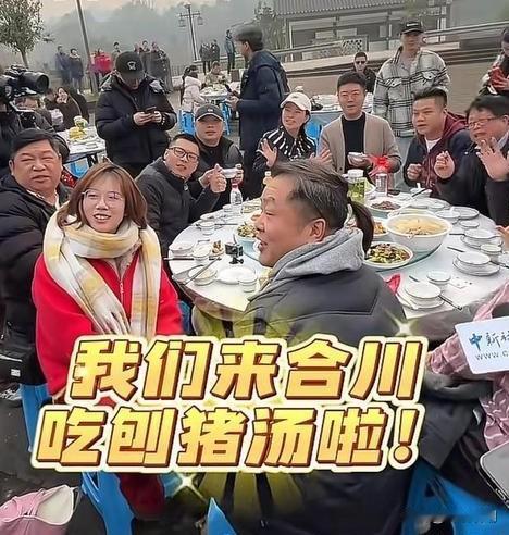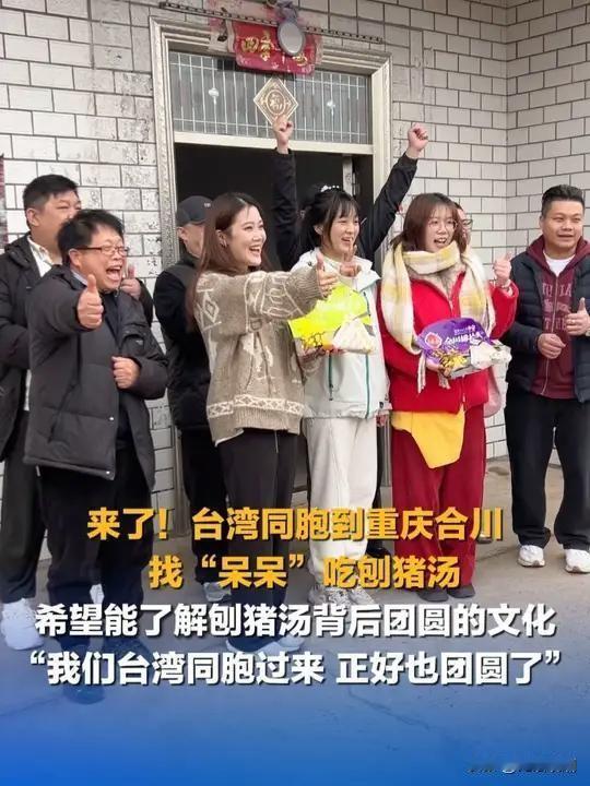 【一碗刨猪汤,海峡两岸的团圆之约】 冬晨的重庆合川庆福村,院坝中央的大锅翻滚着乳白浓汤,猪肉与萝卜的鲜香漫过青瓦。这锅承载川渝年俗的刨猪汤,近日成为连接两岸的温情纽带——重庆姑娘“呆呆妹”一句求助吆喝,不仅唤醒亿万华人的家乡记忆,更让十位台湾同胞跨越海峡,赴一场烟火气十足的团圆之约。 2026年1月初,呆呆妹为帮年迈父亲处理肥猪,在网络发布求助视频。原本只是邻里互助的小事,却在网络掀起热潮,两小时内收到二十多条帮忙私信,直播观看人数飙升至五百万。评论区里,“想起外公家的年味”等留言刷屏,一场乡村民俗意外引发全中国华人的情感共鸣。 这份乡情同样触动了海峡对岸。台湾网友被视频中的烟火气打动,留言询问能否赴约。经媒体报道后,十位台湾同胞订好机票,跨越山海奔赴合川。国台办发言人朱凤莲在例行发布会中提及此事,暖心表示“血浓于水的情感什么时候都赶得上”,邀请更多台湾同胞来大陆感受年味,让这场民间交流更添意义。 台湾同胞抵达当日,庆福村一片沸腾。呆呆妹父母凌晨便起身准备,邻居们自发帮忙,文旅部门备好特产伴手礼。当中巴车驶入村道,台湾客人刚下车就被热情包围,方言与台湾腔的问候交织,距离瞬间消融。 院坝里三十桌流水席开席,台湾同胞跟着村民学按猪、灌香肠,忙得不亦乐乎。刨猪汤的鲜醇、回锅肉的香浓,让大家赞不绝口。婉怡一边喝汤一边拍视频分享:“这里就像自己家一样温暖!”线上直播间1.1亿人次同步围观,“两岸一家亲”的留言持续刷屏。 这场始于求助的刨猪宴,早已超越“吃顿饭”的本意。台湾同胞不仅品尝乡味,更体验了地道民俗,临走时带着腊肉、桃片,约定明年再聚。而合川也借势推出刨猪汤体验点与精品旅游线路,让乡村年味成为文旅新名片。 春节将至,团圆是中华儿女的共同期盼。呆呆妹家的刨猪汤,炖的是邻里温情,更是两岸同根同源的血脉亲情。当台湾同胞与大陆乡亲围坐一桌,碰杯声与笑声交织,便印证了两岸一家亲从不是口号,而是藏在共同年味里、体现在山海牵挂中的真实情感。 这碗热气腾腾的刨猪汤,跨越海峡阻隔,温暖两岸心田。它不仅是一场民俗盛宴,更是两岸民间交流的生动注脚,在辞旧迎新的时刻,诉说着血浓于水的团圆故事,让这份乡情在岁月中愈发醇厚。