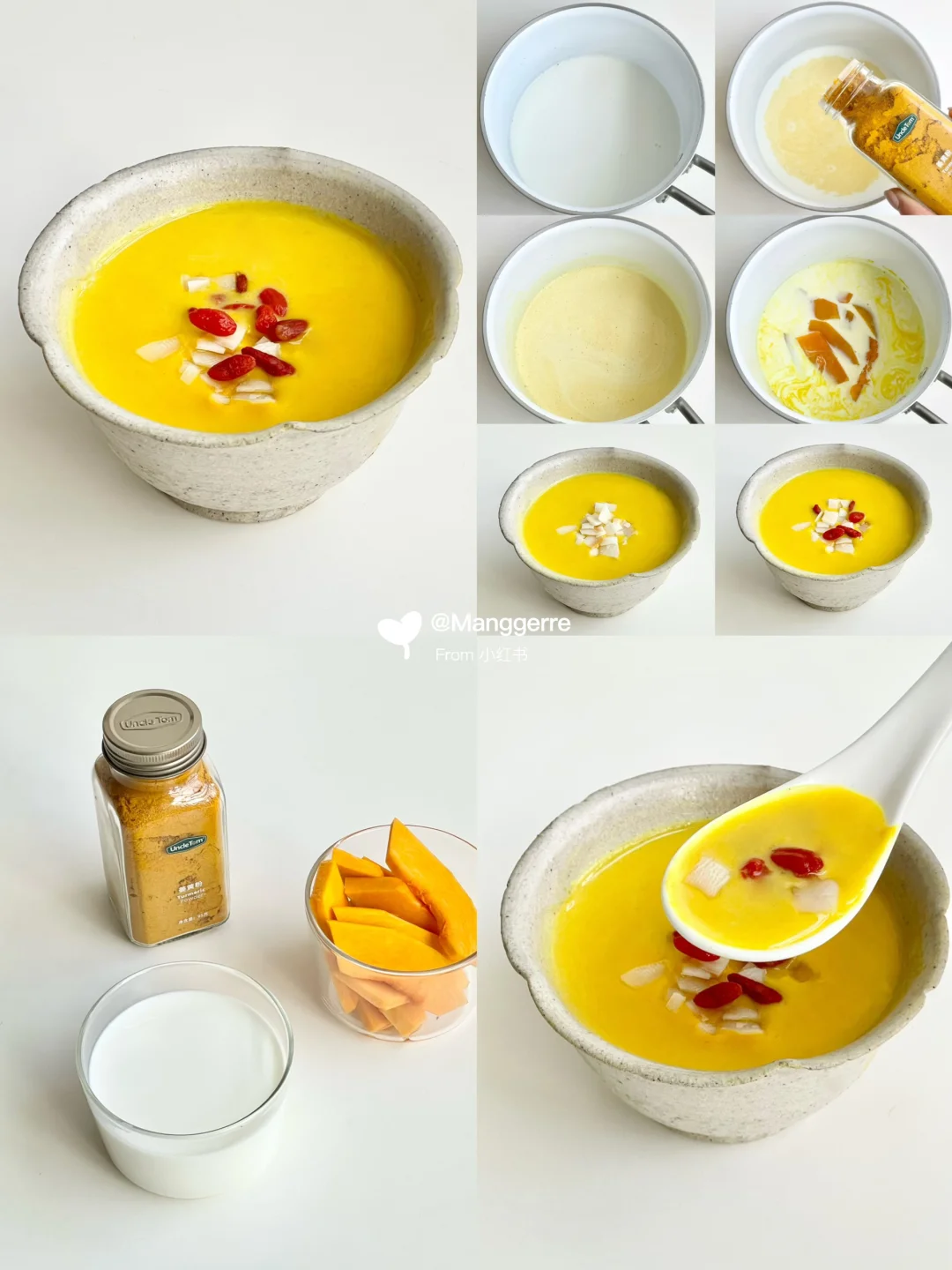 南瓜50g、牛奶250g、姜黄粉5g、椰子片、枸杞