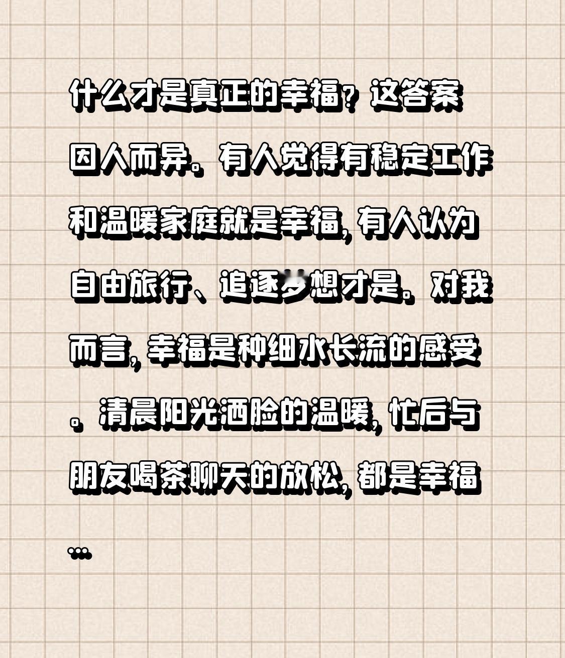 什么才是真正的幸福?这答案因人而异。有人觉得有稳定工作和温暖家庭就是幸福,有人认为自由旅行、追逐梦想才是。 对我而言,幸福是种细水长流的感受。清晨阳光洒脸的温暖,忙后与朋友喝茶聊天的放松,都是幸福。幸福不一定要惊天动地,日常小事带来的满足感就很棒。 幸福也和心态有关,学会感恩珍惜,平凡生活也精彩。同时,为自己而活,勇敢逐梦,看淡得失,有空多陪家人,幸福就在这些点滴里。它一直藏在生活的角角落落,等我们用心发现。