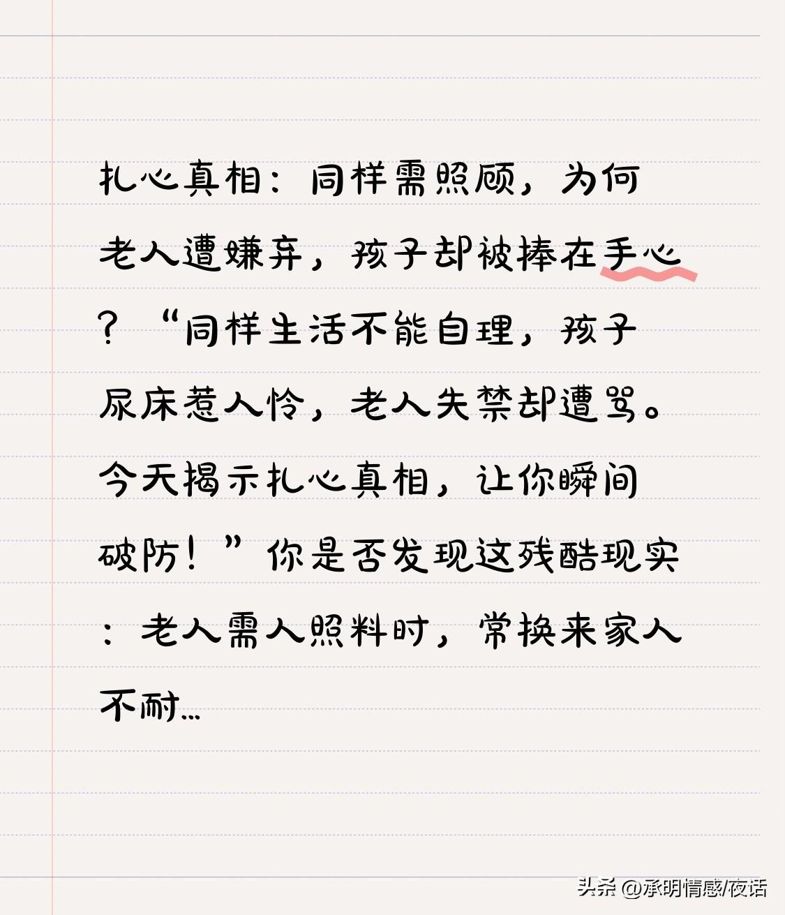扎心真相:同样需照顾,为何老人遭嫌弃,孩子却被捧在手心? “同样生活不能自理,孩子尿床惹人怜,老人失禁却遭骂。今天揭示扎心真相,让你瞬间破防!” 你是否发现这残酷现实:老人需人照料时,常换来家人不耐烦与嫌弃;孩子即便弄脏衣服、走路不稳,也有人小心呵护。 小孩尿床,大人说“孩子小没关系”;老人尿床,却可能被指责“添麻烦”。 为何如此?只因无条件爱他的人不在了。孩子有爸妈, “不能自理”是成长必经;老人父母已逝,“力不从心”成了负担。 孩子哭闹有人哄,老人沉默却被误解。世间偏爱,竟如此现实。 “你觉得是我们变了,还是爱有保质期?评论区分享老人与孩子的不同境遇,下期聊如何打破这心酸轮回。” 照顾父母老人 老人带孩子弊端 照顾孩子误区