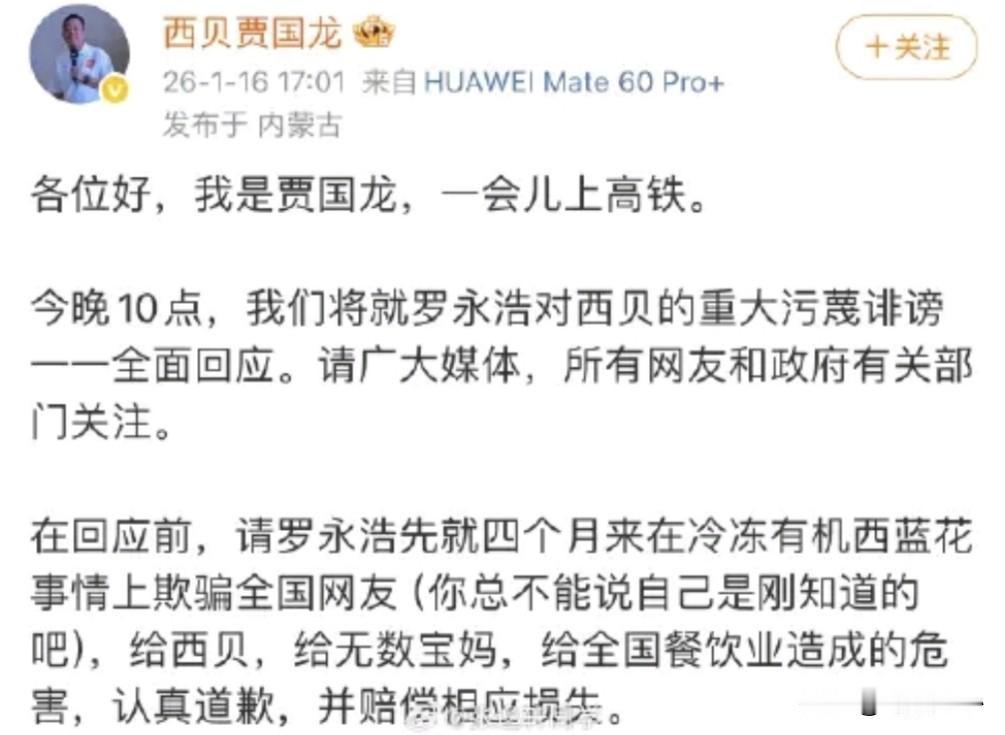 越来越有意思了 今晚10点,贾国龙约战罗永浩! 西贝贾老板要跟罗永浩对线了, 这大周五的,让吃瓜群众开始期待了! 贾国龙的回应也来了 今晚10点,我们将就罗永浩对西贝的重大污蔑诽谤一一全面回应。请广大媒体、所有网友和政府有关部门关注。 这回应,看来贾总还是没走出自己的宇宙。 其实西贝能走到今天,基本是贾总毁灭性公关做的,罗永浩现在还没有回应,大家觉得呢?罗永浩会有怎样的回应?