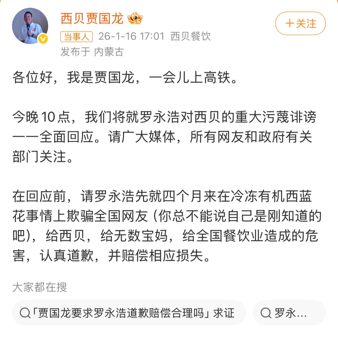 贾国龙让罗永浩道歉赔偿或许是他真的看不惯罗这个人吧,但也没必要拿企业去和人家干啊,再说人家也没想和你对着干,何必呢,拿企业“硬刚”个人,既容易模糊问题焦点,也可能让品牌形象受损,还未必能真正解决纠纷。