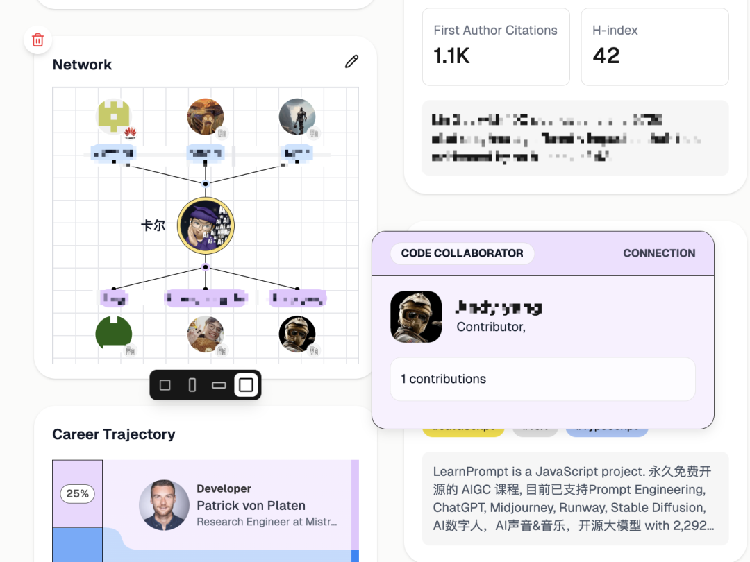 我之前也用过类似的,像是Bento,BuyMyCoffee,Bonjour,都是自定义模块的卡片展示模式。但DINQ不同的点在于它的Network人脉图谱,CareerTrajectory职业画像,以及Discover人才搜索。