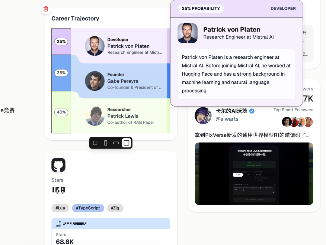 把我更偏向哪类角色做一个归类,比如开发者,创始人,研究员。这里的角色不是我简历上填的职位名,是它从经历,产出,影响力,合作关系(也就是刚刚的人脉图谱)里推断出来的职业原型。