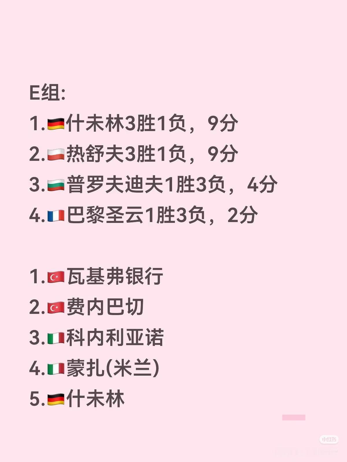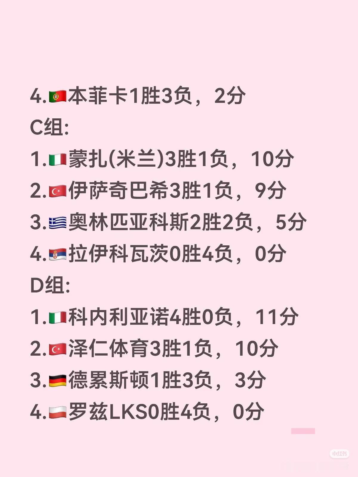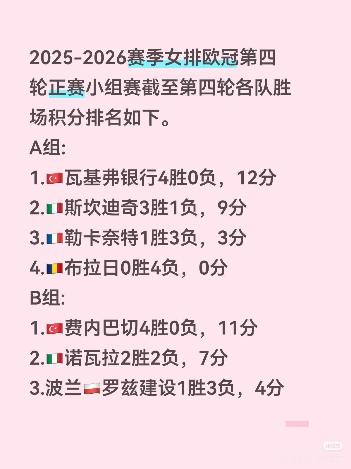 2025-2026赛季女排欧冠第四轮正赛小组赛截至第四轮各队胜场积分排名如下。A组:1.🇹🇷瓦基弗银行4胜0负,12分2.🇮🇹斯坎迪奇3胜1负,9分3.🇫🇷勒卡奈特1胜3负,3分4.🇷🇴布拉日0胜4负,0分B组:1.🇹🇷费内巴切4胜0负,11分2.🇮🇹诺瓦拉2胜2负,7分3.波兰🇵🇱罗兹建设1胜3负,4分4.🇵🇹本菲卡1胜3负,2分C组:1.🇮🇹蒙扎(米兰)3胜1负,10分2.🇹🇷伊萨奇巴希3胜1负,9分3.🇬🇷奥林匹亚科斯2胜2负,5分4.🇷🇸拉伊科瓦茨0胜4负,0分D组:1.🇮🇹科内利亚诺4胜0负,11分2.🇹🇷泽仁体育3胜1负,10分3.🇩🇪德累斯顿1胜3负,3分4.🇵🇱罗兹LKS0胜4负,0分E组:1.🇩🇪什未林3胜1负,9分2.🇵🇱热舒夫3胜1负,9分3.🇧🇬普罗夫迪夫1胜3负,4分4.🇫🇷巴黎圣云1胜3负,2分1.🇹🇷瓦基弗银行2.🇹🇷费内巴切3.🇮🇹科内利亚诺4.🇮🇹蒙扎(米兰)5.🇩🇪什未林6.🇹🇷泽仁体育7.🇮🇹斯坎迪奇8.🇹🇷伊萨奇巴希9.🇵🇱热舒夫10.🇮🇹诺瓦拉11.🇬🇷奥林匹亚科斯