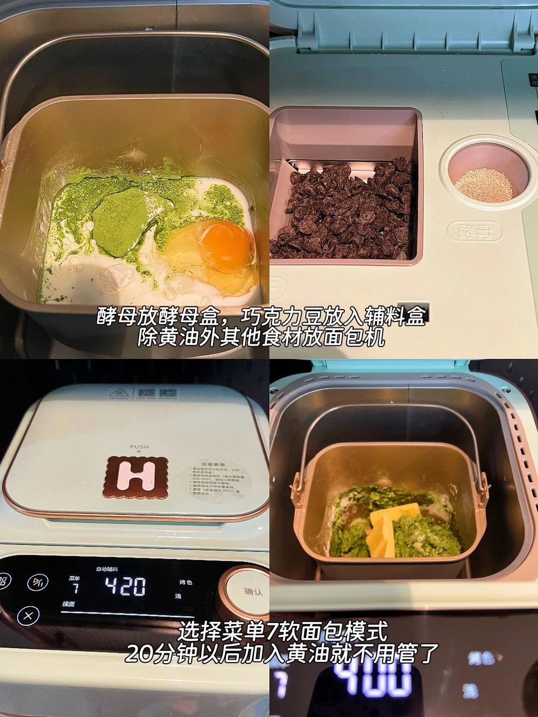 1️⃣酵母放酵母盒,巧克力豆放辅料盒,除黄油外其他食材放面包机