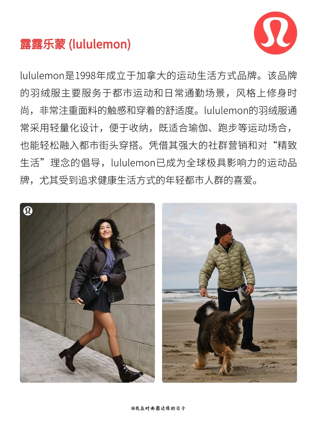 lululemon是1998年成立于加拿大的运动生活方式品牌。该品牌的羽绒服主要服务于都市运动和日常通勤场景,风格上修身时尚,非常注重面料的触感和穿着的舒适度。lululemon的羽绒服通常采用轻量化设计,便于收纳,既适合瑜伽、跑步等运动场合,也能轻松融入都市街头穿搭。