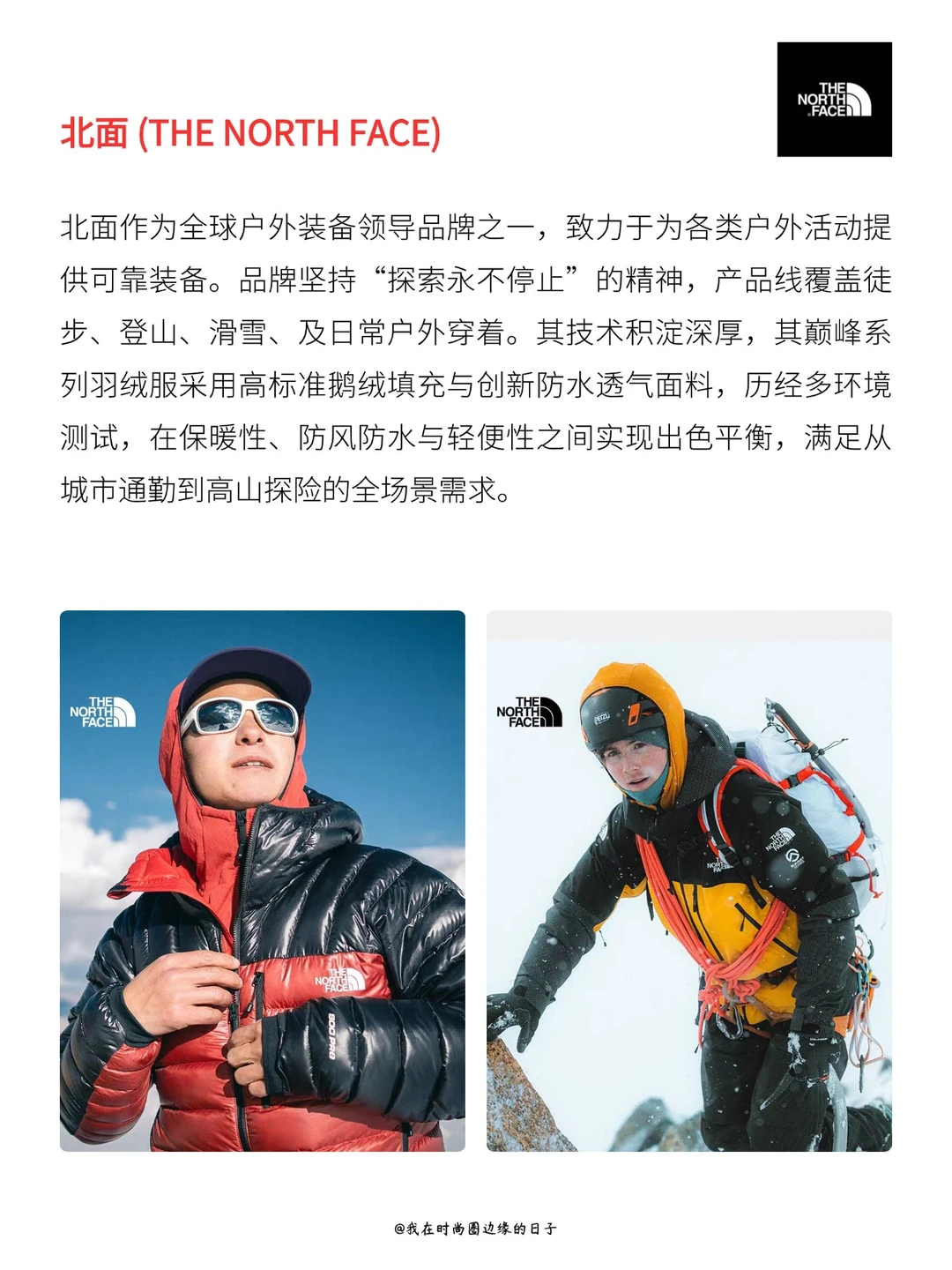 北面是1966年创立于美国旧金山的全球知名户外品牌,名称源自山体最难攀爬的北坡,秉持“Never Stop Exploring探索永不停止”的核心精神。它以专业户外技术为根基,率先应用GORE-TEX、FUTURELIGHT等尖端面料,产品线覆盖登山、滑雪、徒步等专业装备及都市潮流系列。品牌兼具专业性能与时尚影响力,通过多支线布局和跨界联名风靡全。