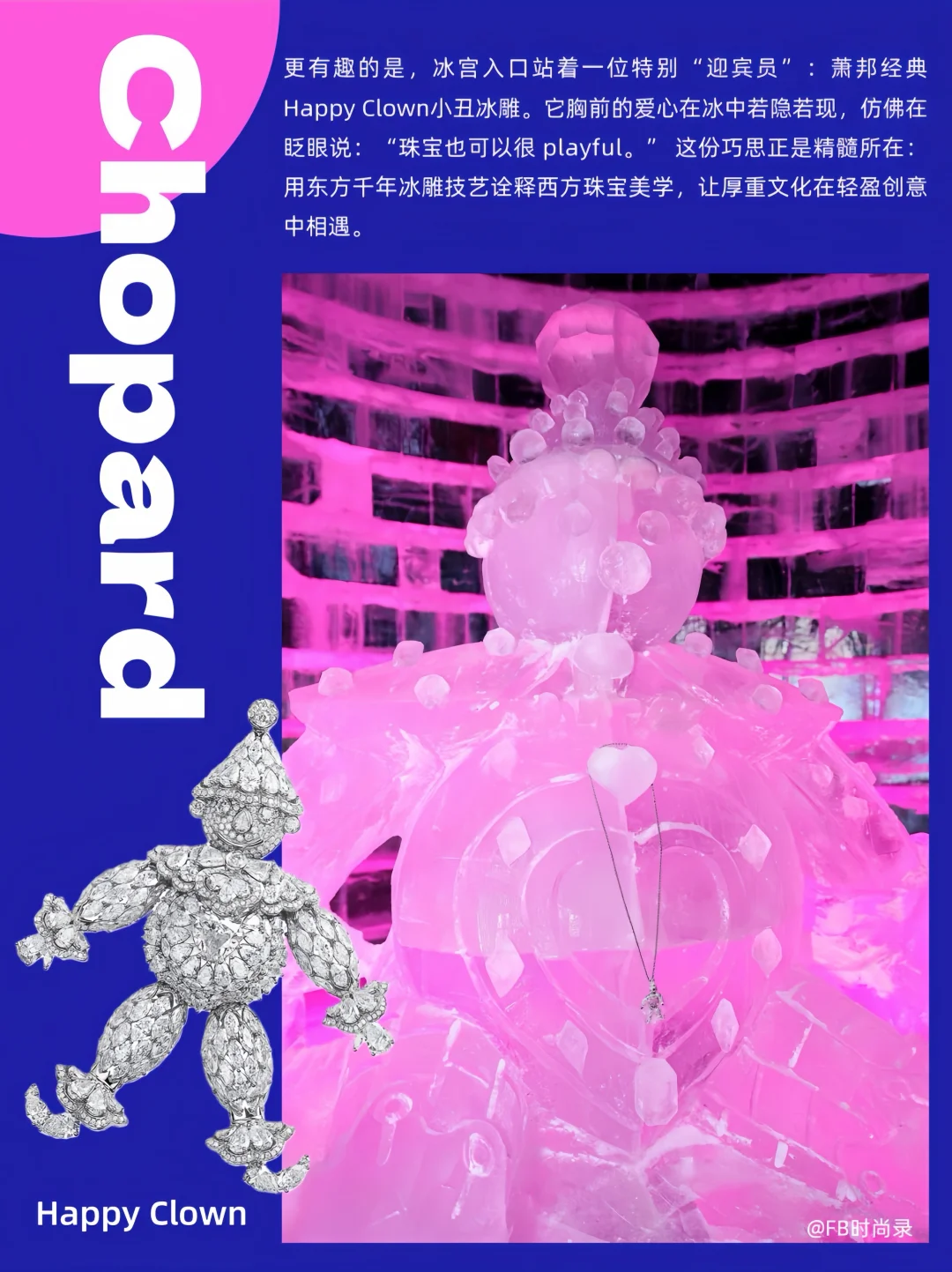 ☃️ 更有趣的是,冰宫入口站着一位特别“迎宾员”:萧邦经典Happy Clown小丑冰雕。它胸前的爱心在冰中若隐若现,仿佛在眨眼说:“珠宝也可以很 playful。” 这份巧思正是精髓所在:用东方千年冰雕技艺诠释西方珠宝美学,让厚重文化在轻盈创意中相遇。