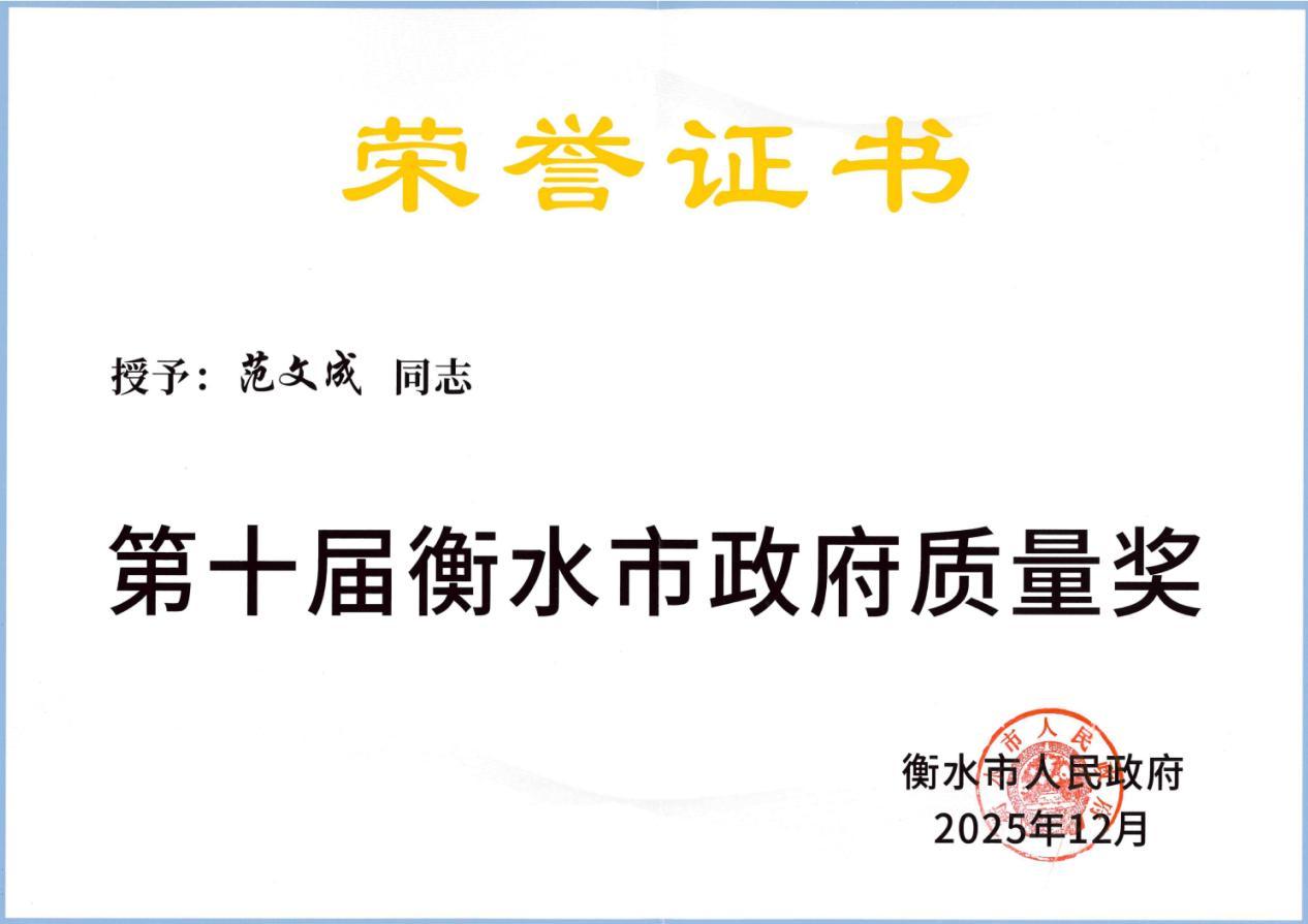 衡水市政府质量奖是市人民政府设立的最高质量荣誉,旨在表彰在质量管理、品牌建设、技术创新、精益生产、经营效益和社会责任等方面取得显著成就的组织和个人,树立行业标杆,推动全市经济高质量发展。本届评选经过严格评审和公示程序,最终确定获奖名单。