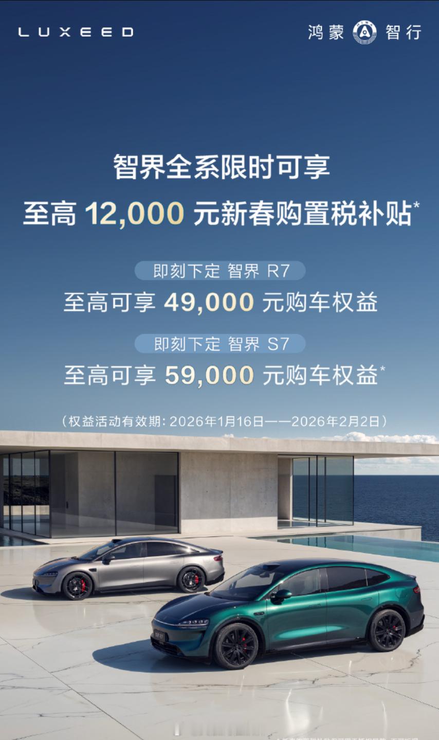 鸿蒙智行——智界和享界的1月新车销售政策来了1月16日至2月2日,购买智界全系车型可享受至高12000元新春购置税补贴;智界R7 还可享购车权益至高42000元,智界新S7 购车权益至高59000元;享界S9 同步加码,即日起下定即可享受至高价值60000元购车权益新能源汽车鸿蒙智行
