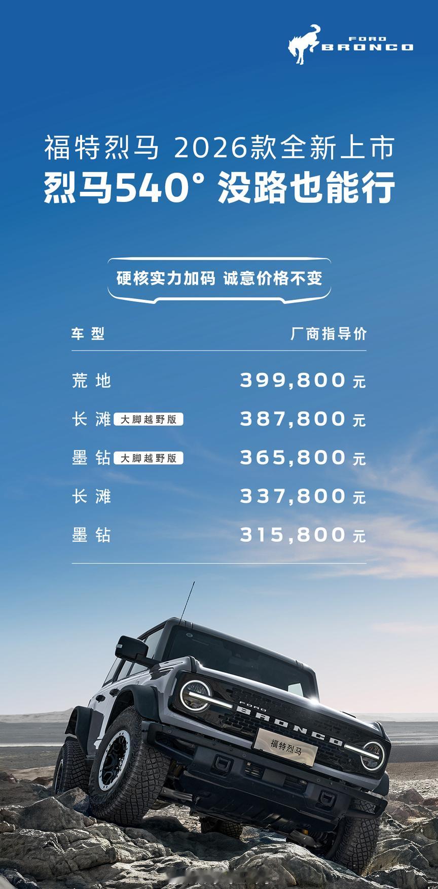2026款福特烈马上市,整体变动不大,价格没变,全系标配全景影像+越野透明底盘。