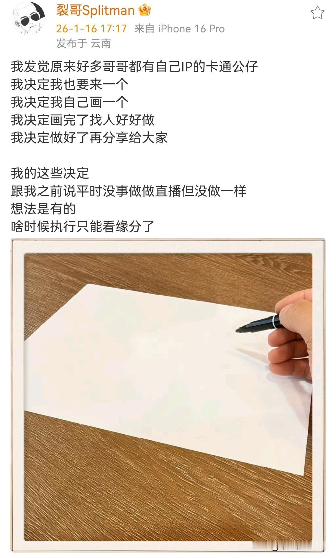 1月16日,苏醒用小号发文说:“我发觉原来好多哥哥都有自己IP的卡通公仔,于是他自己也决定做一个。至于什么时候生产,那就要看缘分了。” 我记得生哥有一个巡演公仔叫“六毛”,看起来非常可爱,应该卖的不错。 苏醒在评论区晒出了公仔的第一版画稿,看这草率的画风,应该是出自醒哥之手。 如果公仔的价格合适,我也会买一个留作纪念,大家觉得呢?