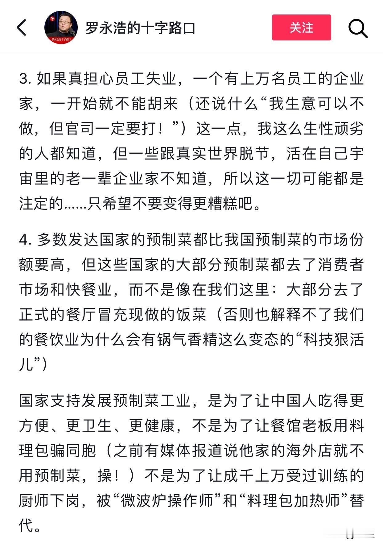 罗永浩发长文回应西贝关店事件 这件事他不得不回应 否则西贝员工失业这口锅 就得扣在老罗头上了 全文看下来真佩服老罗的逻辑性 他说清楚三件事就行了 公司倒闭跟被黑无关 真担心员工失业,老板应当先自省 预制菜不可以冒充现做的菜 记得当时老罗就是发了几句牢骚 然后贾老板莫名其妙开始自残 他非要公开后厨让顾客检验 结果发现一堆预制菜[笑哭] 最后撑不下去了又要怪老罗 哪怕西贝有一天真倒闭了 责任也不能算老罗头上吧 你一个知名企业这么脆弱吗? 顾客花着去餐厅吃饭的钱 吃你家做的预制菜? 但凡你是“拼好饭”的价格也没人说啥 问题的关键是你们欺骗消费者 而不是老罗的爆料 老罗文章最后提到了谭秦东 这招真厉害👍 搜一下“鸿茅药酒”事件 马上就能懂罗永浩的意思了
