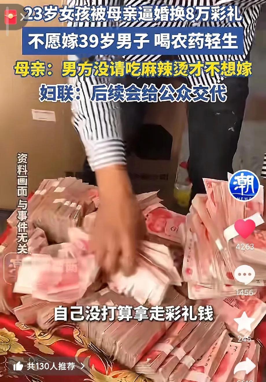 湖北23岁女孩被逼婚喝药,母亲做的太绝了! 1.让23岁的女儿嫁给近40岁的老男人,嘴上说着是远亲,知根知底,而事实上以前都没见过,和女孩也是去年才认识的。 2.女孩以前被父亲家暴,然后摔下楼梯,脑袋就有一点不好使,后来一直当保安,每个月挣两三千块钱,省吃俭用,好不容易攒了6万元。 结果这6万元全都被她妈要走了,后续记者采访,她妈说是买房子不够用,从她那儿借点。 在ICU家属看望的半个小时里,妈妈还又问走了女孩银行卡密码。 3.妈妈想让女孩跟这个老男人结婚,用各种方法逼迫,还把女孩的所有联系方式都拉黑了,最终女孩无奈之下,还是领了结婚证。 4.女孩妈妈的采访真的前言不搭后语的,说一开始不想要彩礼钱的,只想让她们过的好好的,然后下一句就是,这8万块钱彩礼是打算给女孩带到他们的小家庭的。 5.女孩都已经在ICU生死未卜了,而母亲的语气里没有丝毫悲伤,只是来了一句,她不愿意就算了。