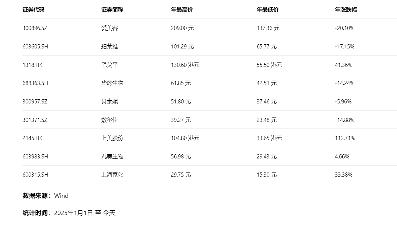 而前几年备受市场追捧的“成分党”代表和科技护肤龙头则在2025年普遍面临压力:贝泰妮股价下跌5.96%,华熙生物股价下跌14.24%,敷尔佳股价下跌14.88%。这一定程度上可能意味着,市场对单纯依赖大单品和营销驱动的增长可持续性,以及相关公司的高估值进行了重新审视与回调。