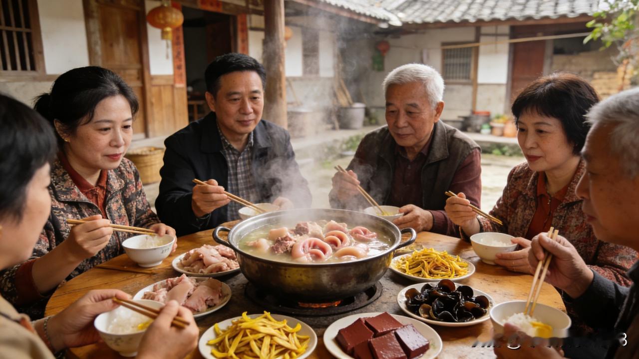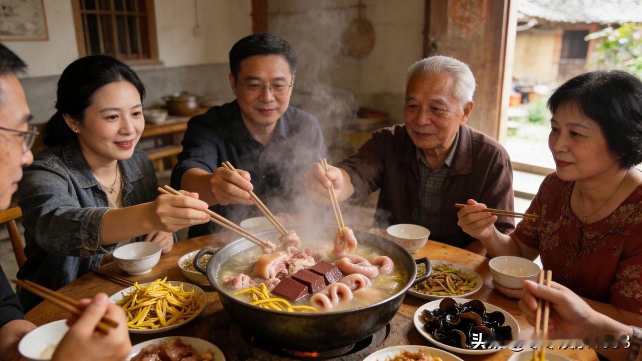 最近有个暖心故事在两岸传开:台湾的 10 位小姐姐组团来到大陆,兴冲冲直奔一户叫 “呆呆家” 的农家。谁料主人家早备下惊喜 —— 一场热气腾腾的刨猪宴,瞬间让两岸姐妹的心紧紧贴在了一起。 刨猪汤是川渝农家的团圆味道,滚烫的锅里,肥瘦相间的猪肉卷着鲜滑的粉肠、嫩滑的猪血,加上黄花菜和木耳打底,一勺猪油浇下去,肉香混着葱姜的气息在锅里咕嘟冒泡,连空气都变得暖烘烘的。台湾姐妹第一次喝到这口汤时,眼眶都红了:“原来大陆的年味儿,是这样实实在在的温暖。” 主人家笑着添了句:“咱们本就是一家人,哪分什么两岸?” 这桌刨猪宴,没有山珍海味,却盛着最质朴的情谊。就像那碗冒着热气的汤,肥而不腻的肉片裹着汤汁滑进嘴里,暖的是胃,更是心。原来两岸同胞的牵挂,从来都藏在一碗热汤、一桌家常里,这才是刻在骨子里的团圆味道。
