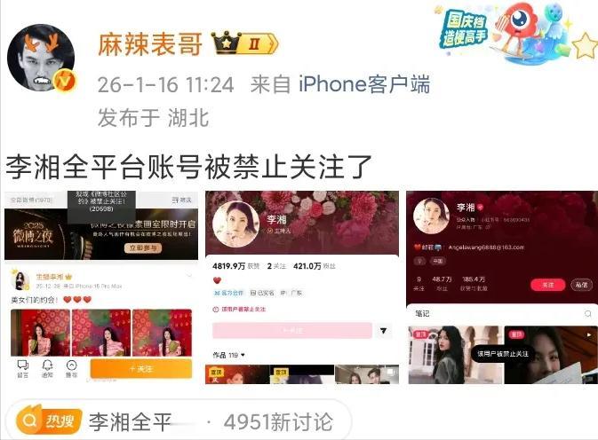 一觉醒来,李湘出事了!多家媒体报道她全网账号已被禁止关注,咋感觉这“封杀”力度,与当年“小燕子”一夜之间被各大平台除名下架,如出一辙,可她到底犯了什么错?只能说人在做天在看~ 李湘又咋了?闫学晶的事还没过去呢!无数网友都是一脸懵,可被如此迅速的直接封杀到这个地步,感觉不单单是她平日频繁带女儿混迹名流晚宴,高调炫富惹的祸,高度怀疑多半已涉嫌违法犯罪......毕竟连偷漏税被罚8.8亿的女星范冰冰,也没享受过此种“待遇”!不过,如今可以断定的是,这次李湘犯的事,绝对比范冰冰要大。果然呀!人在做,天在看,出来混迟早是要还的!