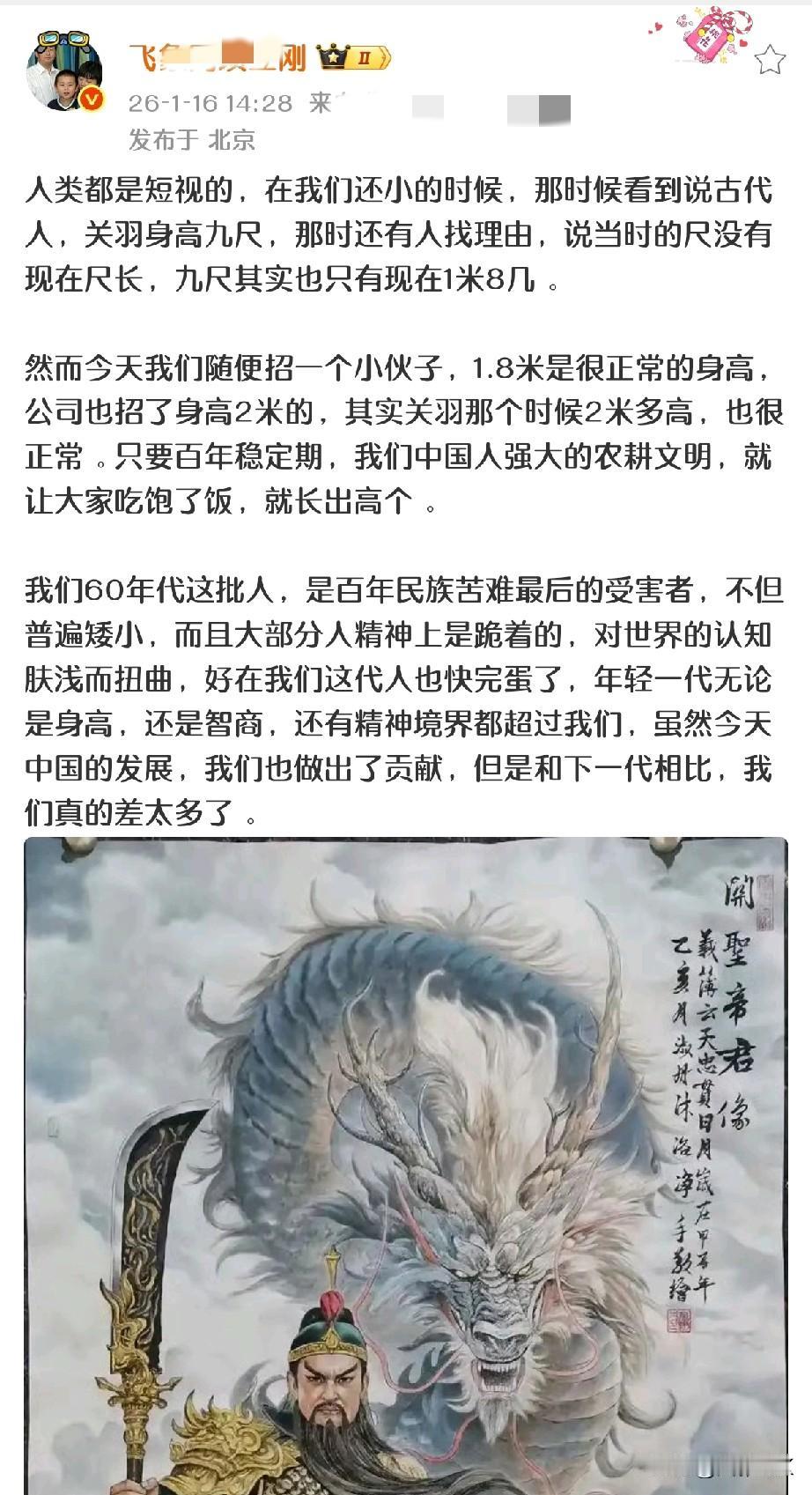 项大郎,把身高问题甩锅“出生时代” 说矮小,是因为他那个年代的人经历太多的苦难,吃不饱,营养不良所致... 不过有一点,他说得没毛病,就是“只要百年稳定期,我们中国人强大的农耕文明,就让大家吃饱了饭,就长出高个。” 没错,时代发展,信息通畅,国泰民安,老百姓安居乐业,生活条件在不断变好,生理营养和精神营养丰富,人的身体体质和健康指数自然会不断上升! 社会百态