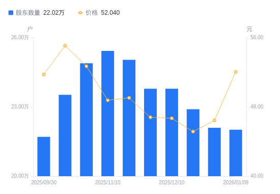 日期A股户数(户)流通A股户均持股数(股)户均持股市值(万元)2025-12-312209744802.4722.302025-12-192289984634.1920.922025-12-102379034460.7320.832025-11-282378784461.2020.882025-11-202503934238.2220.792025-11-102542424174.0620.362025-10-312489274263.1822.472025-10-202352324511.3824.852025-09-302170594889.0925.302025-09-192299634614.7523.66
