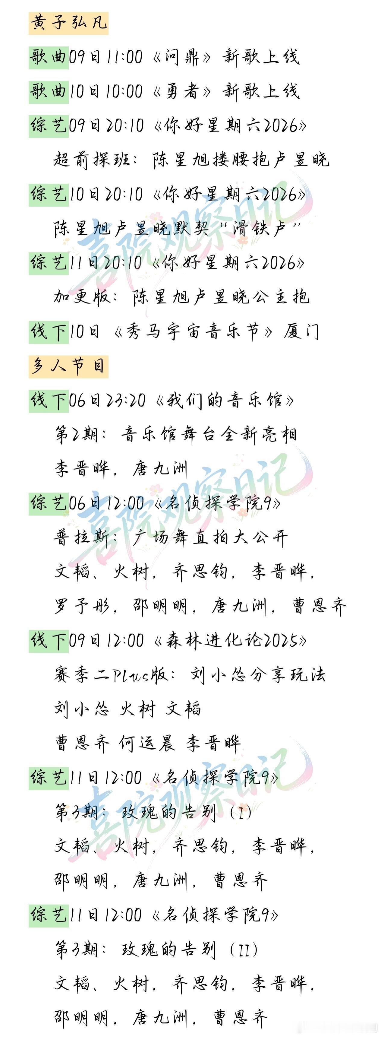 院人上周行程汇总!10.0欢迎观看院人2026年第二周行程全梳理,从节目播放到公开亮相,每一个瞬间都藏着惊喜,快码住这份超全汇总~📅 上周行程亮点速报1. 森林进化论收官2. 恩齐又上新歌3. 黄子新一期好六上线院人‖名侦探学院‖