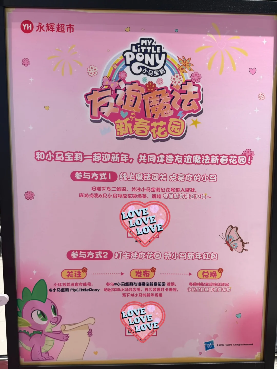 🌈上海马年新年进度条已至98%,周末带妮妮去永辉超市囤货,各式各样的年货已摆放的满满当当,红红火火。刚进门就被小马宝莉友谊魔法新春花园的打卡墙吸引住了,与👧今日穿搭匹配指数💯