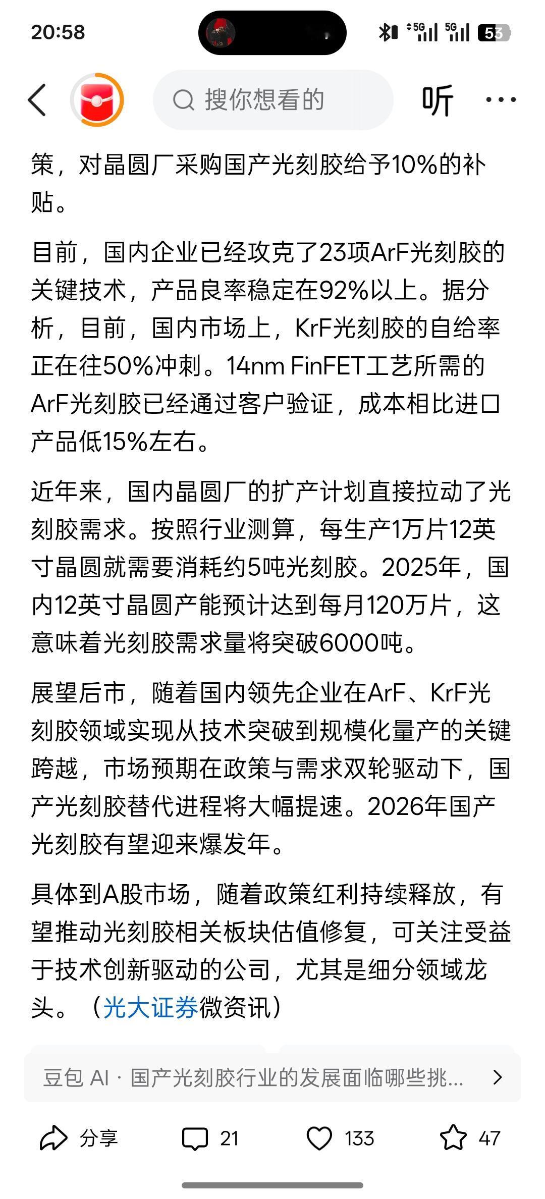 利好芯片半导体国产替代,工信部透露“国产光刻胶最新进展” ,2026年相关行业国