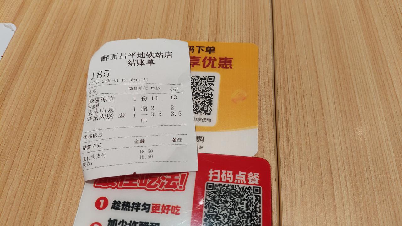 今儿在地铁昌平站口附近的面馆吃了顿。点了份四川麻酱凉拌醉面,13块钱,面条筋道,麻酱香味浓郁,带着四川特有的麻辣味,很是过瘾。还加了个开花淀粉肉肠,才3.5元,口感软糯,淀粉感十足,和醉面很搭。又买了瓶2块钱的农夫山泉水,一顿饭吃得舒舒服服。这家面馆价格实惠,味道也不错,以后路过还会来。 花椒油麻酱面条